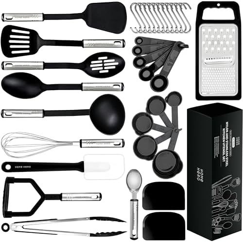 Worth the Investment - This all-in-one high quality black utensil set includes: 1 Ice Cream Spoon, 1 Spatula, 1 Grater, 1 Whisk, 1 Potato Masher, 1 Set of Tongs, 1 Solid Spoon, 1 Soup Ladle, 1 Slotted Turner, 1 Solid Turner, 1 Slotted Spoon, 5 Measuring Cups, 5 Measuring Spoons, 12 Hooks, 2 Dough Scrapers