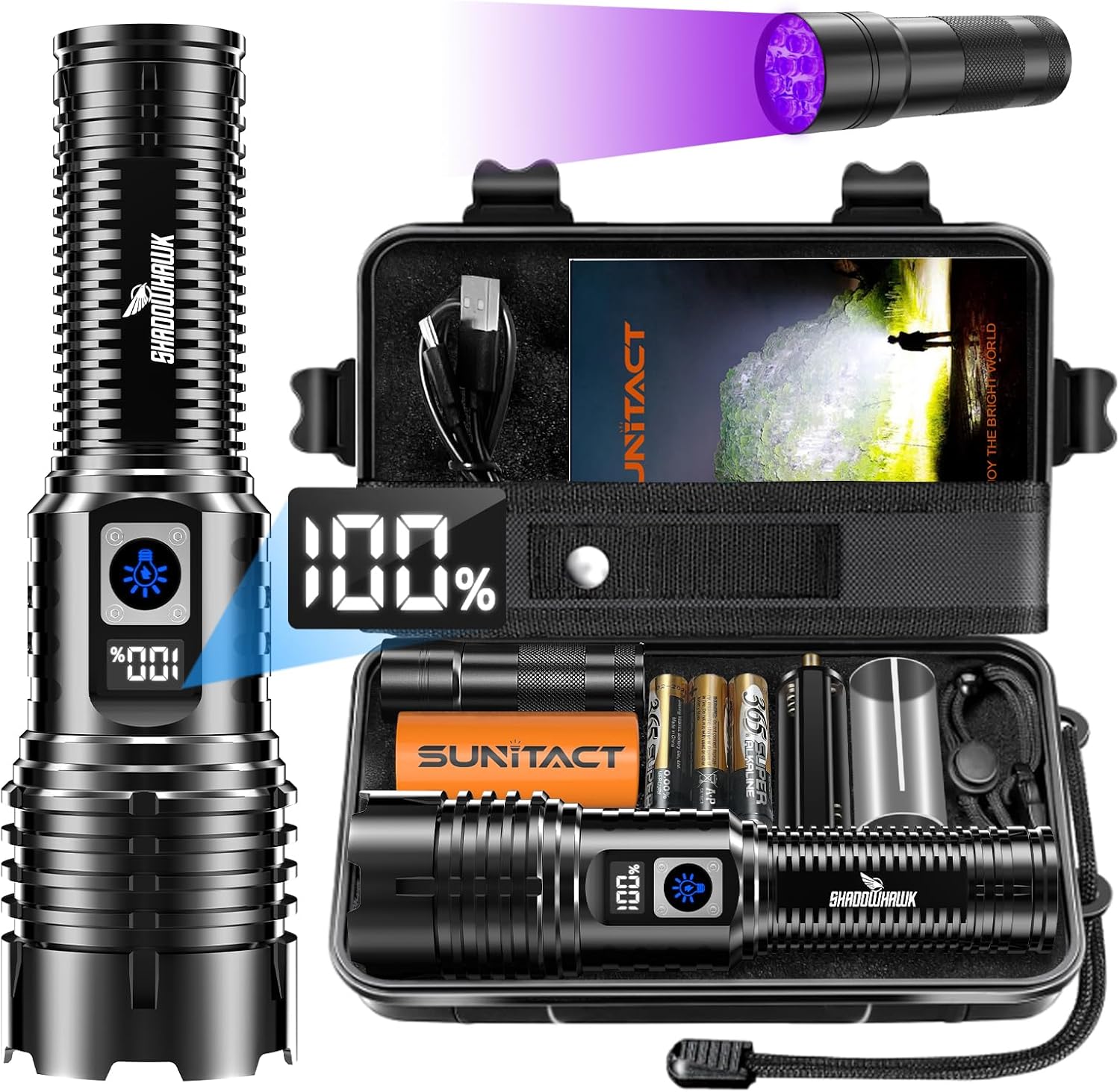 【PACKAGE LIST & AFTER-SALES SERVICES】What you will get : 1x Sunitact ST1695 powerful flashlights, 1x UV blacklight flashlight, 1x Powerful battery and USB charging cable, 3x AAA Batteries, 1x Lanyard and holster, 1x Manual and Gift box. You will be pleasantly surprised by the brightness, quality, longevity and performance of the flashlights high lumens battery powered. If you have any questions about the usb flashlight, please feel free to contact us. We will be happy to answer your questions.