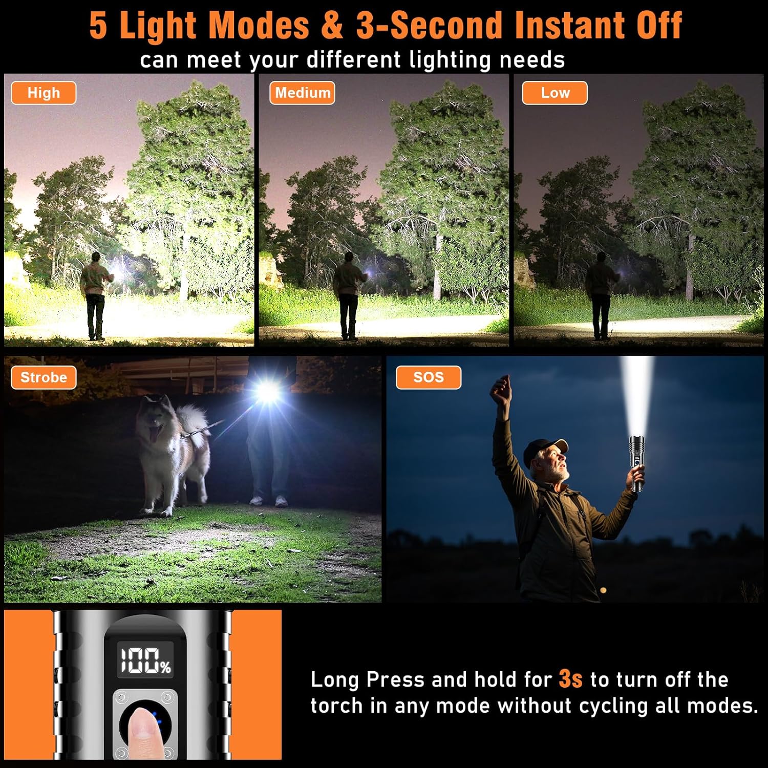 【LCD POWER DISPLAY | USB INPUT | USB OUTPUT】This rechargeable flashlight has been upgraded with the unique LCD power percentage display, at a glance, you can always grasp the remaining power. As well, this LED flash light has been completely improved to shorten the charging time and extend the service life, which can provide up to 12 hours (Low mode) of powerful, non-diminishing brightness. Built-in USB interface, it's more convenient to charge. It can also charge the phone in an emergency.