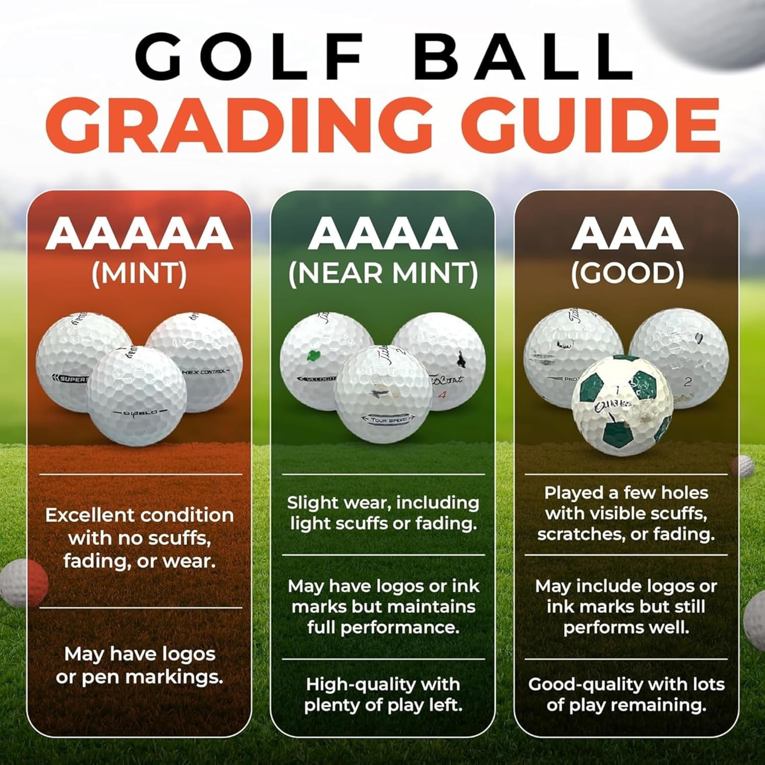 ⛳ SURFACE CONDITION - Pro v1 balls may show minimal wear such as scuffs. scratches, fading and/or logos, but they maintain their original core integrity and aerodynamic properties for reliable distance and accuracy