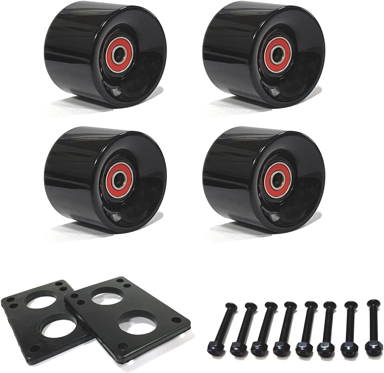 Package Included:pack of 4 skateboard wheels with bearings and spacer,2 skateboard riser pads,8pcs skateboard hardware/screws,suitable for beginners when playing short longboard,cruise board,penny board.