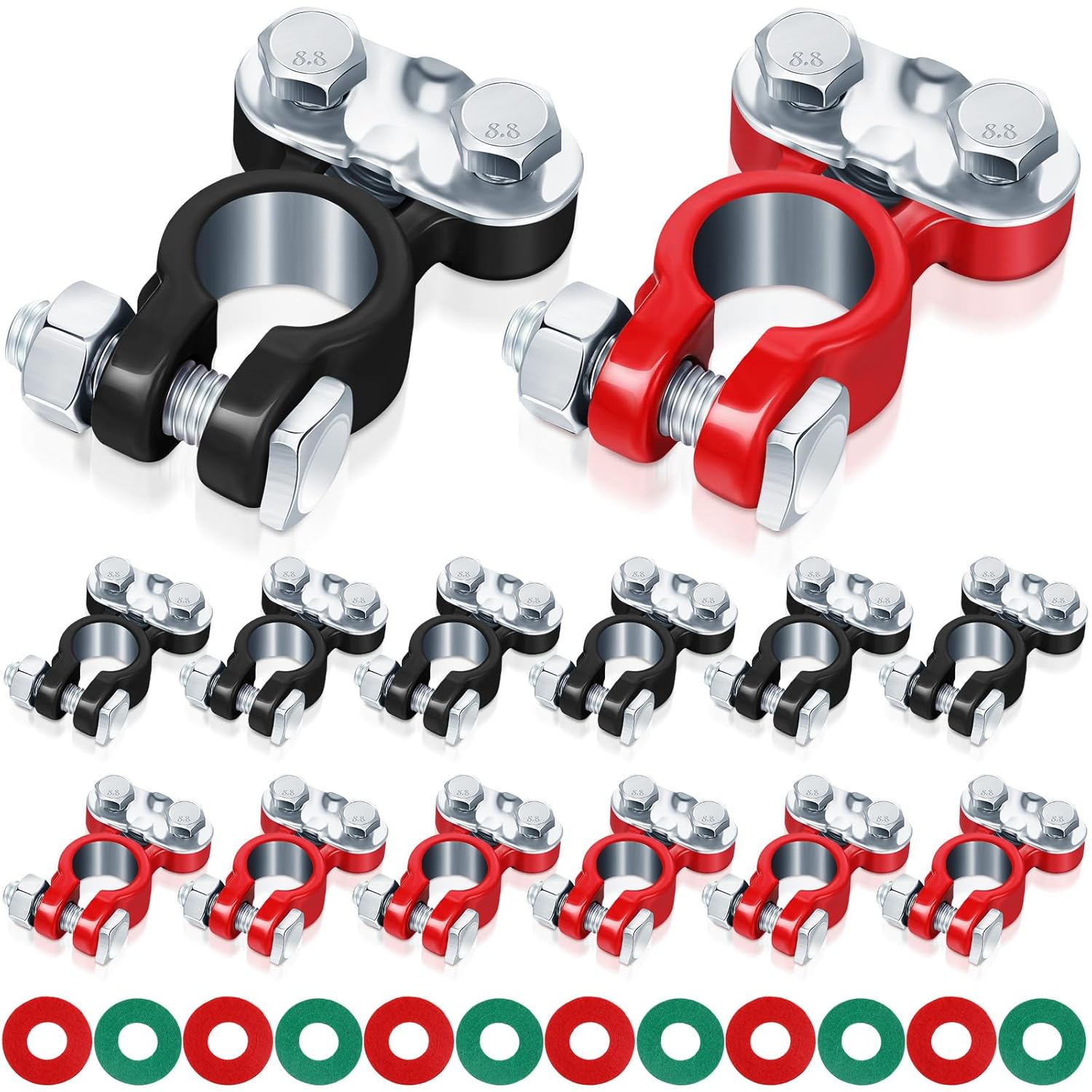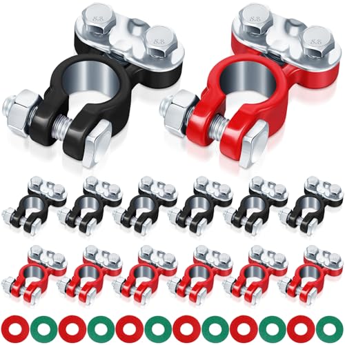 Features: There are fiber anti corrosion washers that prevent corrosion around the battery terminals and extend the life of the battery. Easily replace your vehicle battery's top terminals and post washers, easy to use, direct fit and no modifications, make it faster and easier for installation. Specifications: Material: galvanized, fiberColor: Car battery terminal: red, black and silverFiber battery terminal protector: red and greenSize: as picture showsPackage includes: 30 x Car batteries connectors15 Pairs fiber terminal washersNotes: Manual measurement, please allow slight errors on size. The color may exist a slight difference due to different screen displays. Please wash your hands carefully after use.