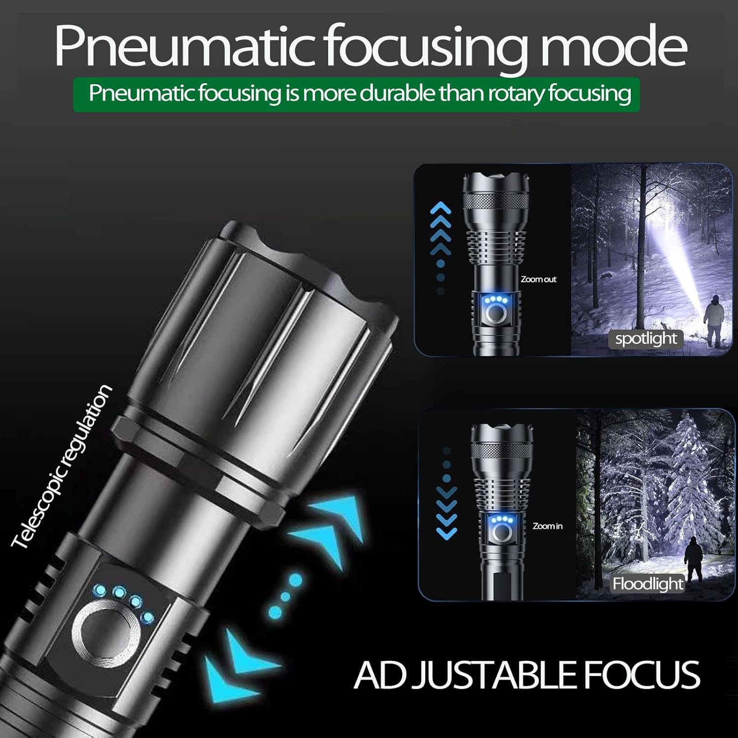【XHP50 LED Flashlight Super Bright】The flashlight adopts the latest XHP50LED bulb, the light is uniform, it is not easy to short-circuit after long-term work. The output power up to 10000 lumens and the service life is as high as 10000 hours. The rechargeable flashlight has a range of up to 3937 feet, the LED flashlight can work for 12 hours (Low mode). No need to worry about the rechargeable flashlights running out of electricity outdoors.