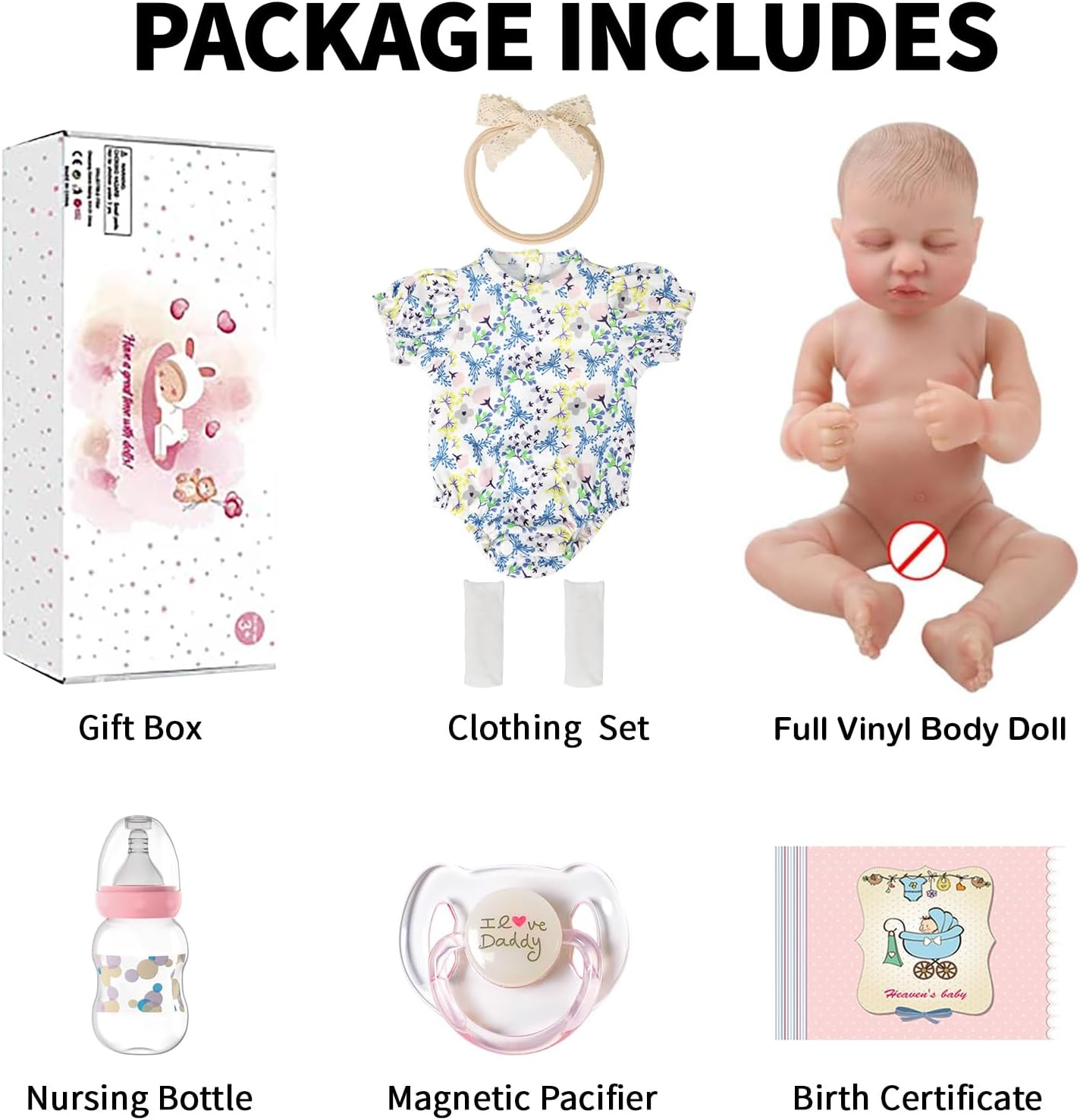 Conjunto de Regalo Premium con 6 Accesorios: Viene con muñeca reborn niña×1, Trajes×1 (como en la imagen), Chupete Magnético×1, Botella Juguetes×1, Pañal×1, Certificado de Nacimiento×1, Pulsera de Recién Nacido×1, y Caja de Regalo de Lujo×1 para deleitar a cualquier destinatario. Ideal para regalos de Navidad/cumpleaños, terapia para Alzheimer, o coleccionistas de muñecas – solo desempacar y empezar a crear recuerdos.