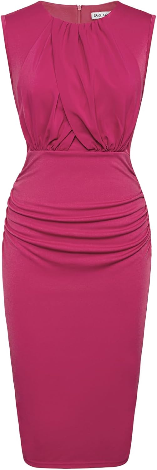 GRACE KARIN Women's Ruched Bodycon Dress Summer Sleeveless Front Drape Patchwork Crew Neck Midi Cocktail Dress