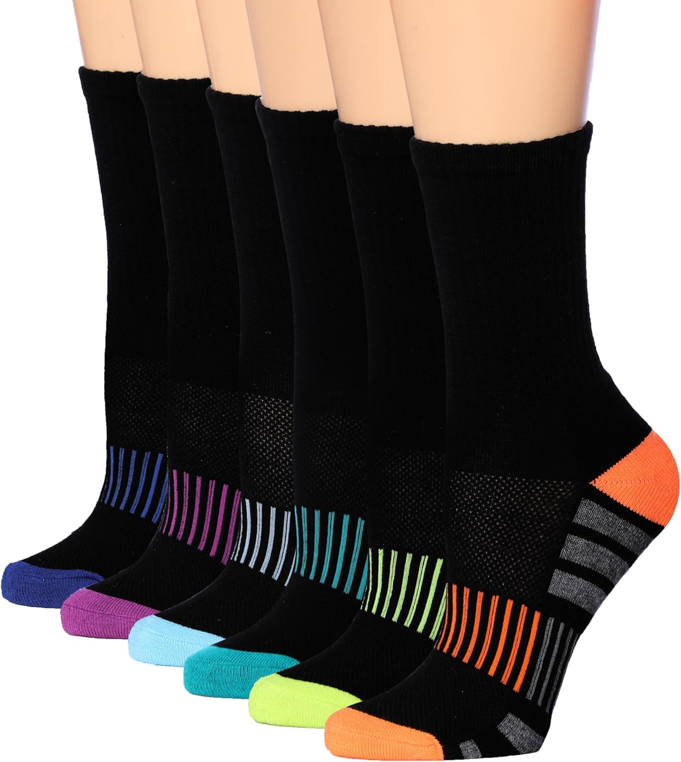Tipi Toe Women's 6-Pack Athletic Arch Support Socks - Thick Cushion, Breathable for Running & Sports Activities Size 10-13