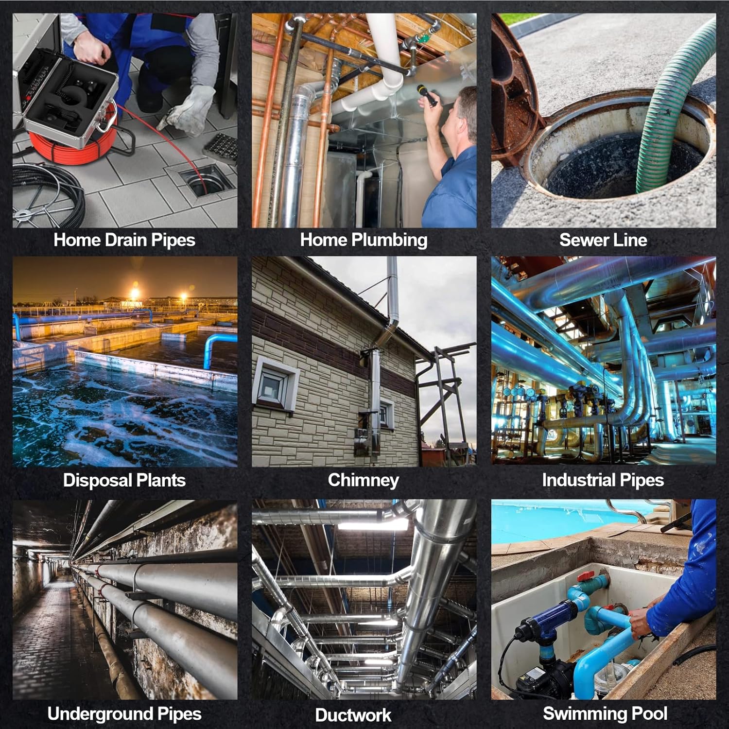 VERSATILE APPLICATIONS - The compact dimensions of the pipe camera snake (L*W*H: 12.4*15*8.9 inch) make it highly portable, conveniently housed in a protective carrying case alongside all accessories. This ensures easy storage and transport wherever necessary. The plumbing camera excels in simplifying the challenging task of inspecting sewer lines, drains, wells, chimneys, machinery, ducts, tanks, railways, general buildings, and various narrow underground environments.
