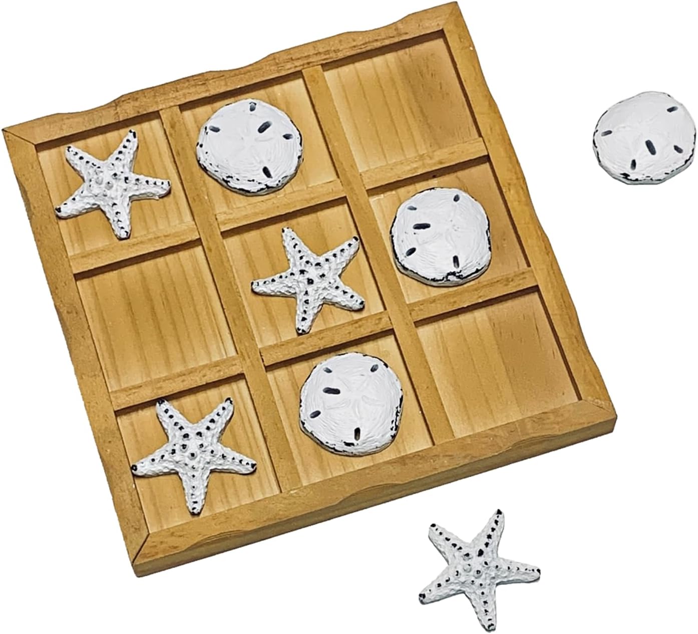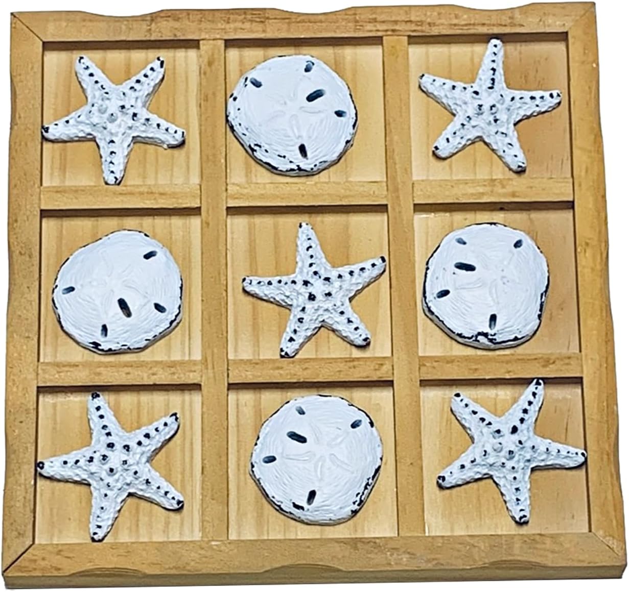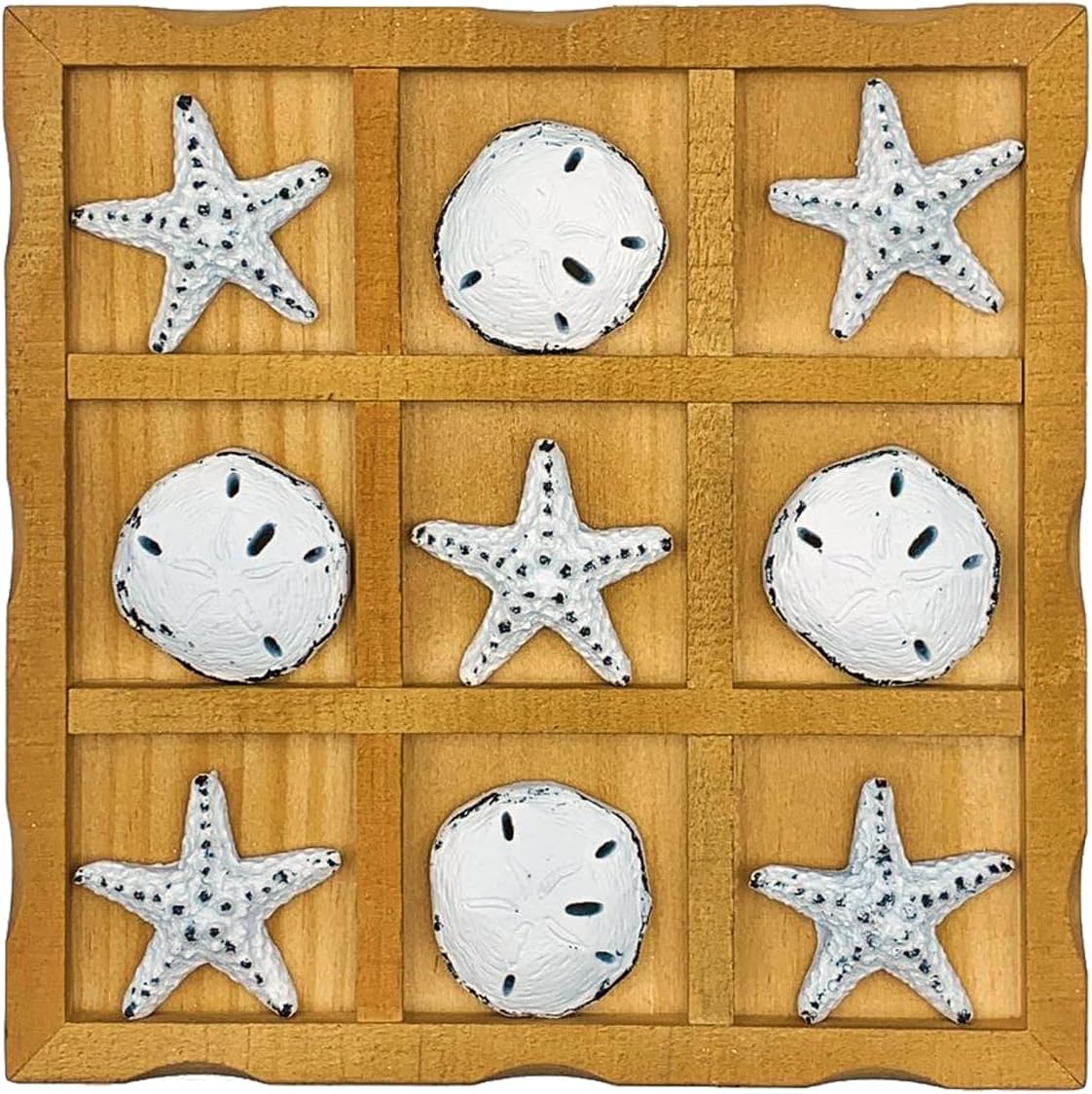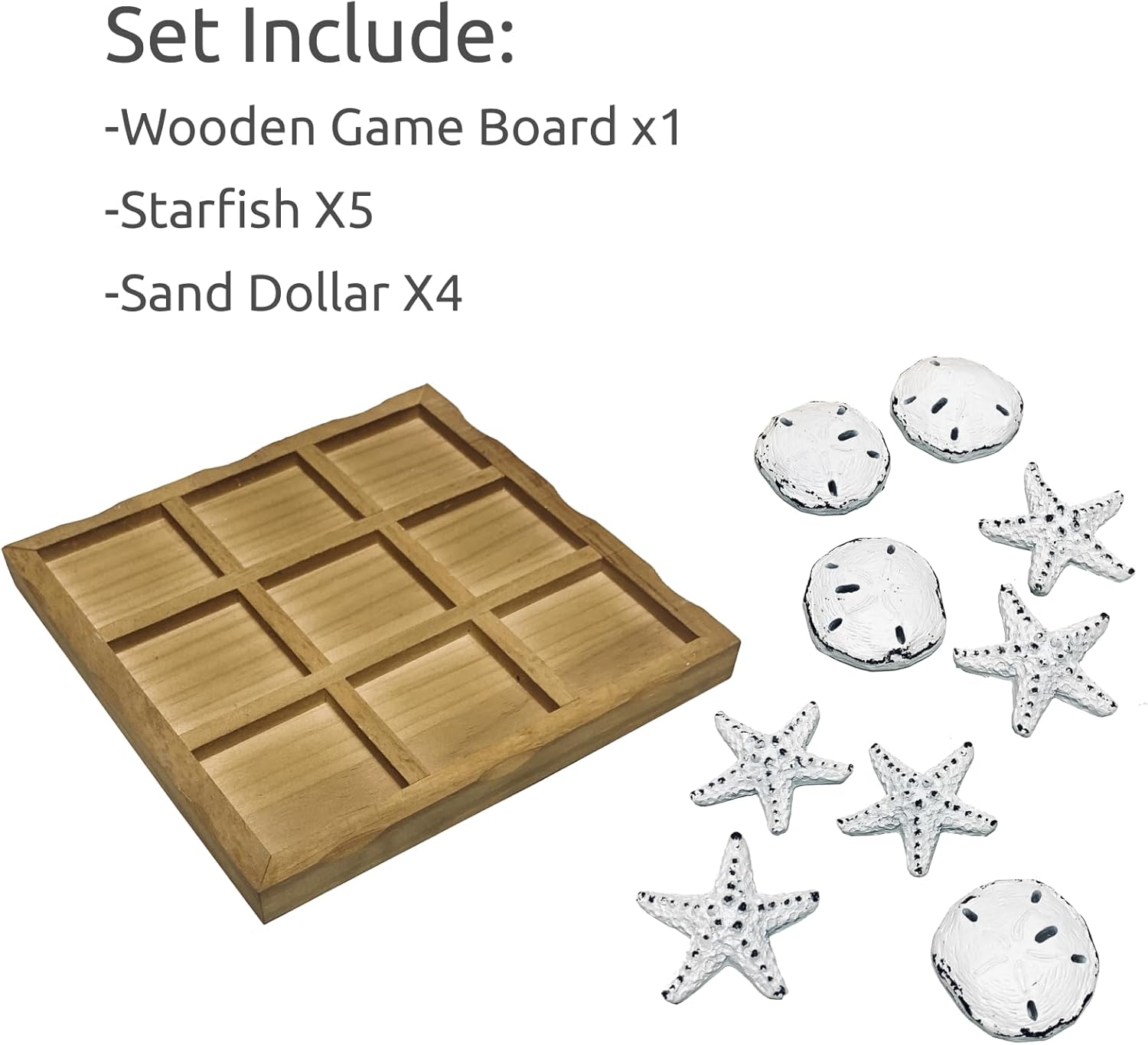 Juego de Tic Tac Toe de Madera Decoración de Playa con Monedas de Arena y Estrellas de Mar para Juegos de Mesa Familiares o Fiestas 9 X 9 pulgadas