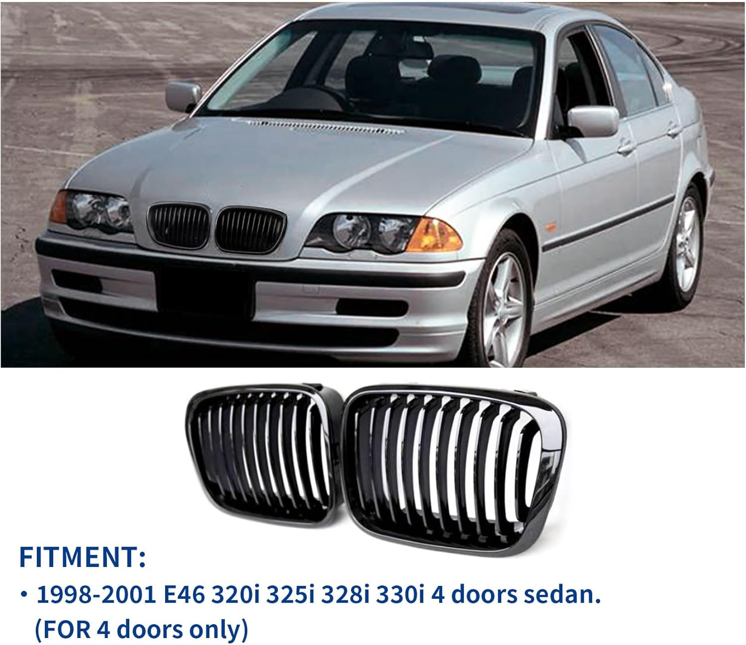 VEHICLE FITMENT:These front grill is compatible with 1998-2001 E46 320i 325i 328i 330i 4 doors sedan (for 4 doors only)(OEM No.: 51132158542; 51132158543)(NOTE:please confirm whether the front kidney grille match your car before purchase!!!)