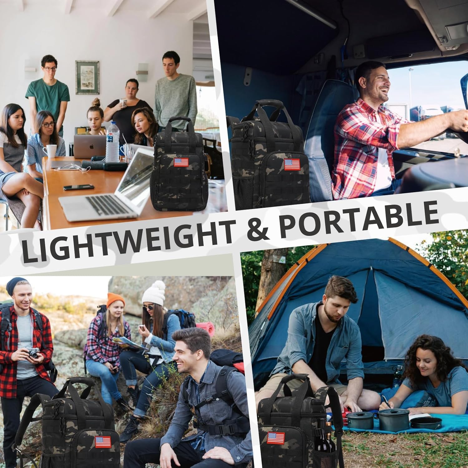 Strategically Designed for Efficiency:ATRIPACK tactical backpack cooler is equipped with essential features including a flag patch, carabiner, and removable bottle opener. The MOLLE webbing on the front enables attachment of pouches or small items, while seven functional pockets ensure efficient organization of drinks, snacks, utensils, food, and personal items, keeping them separate and easily accessible.