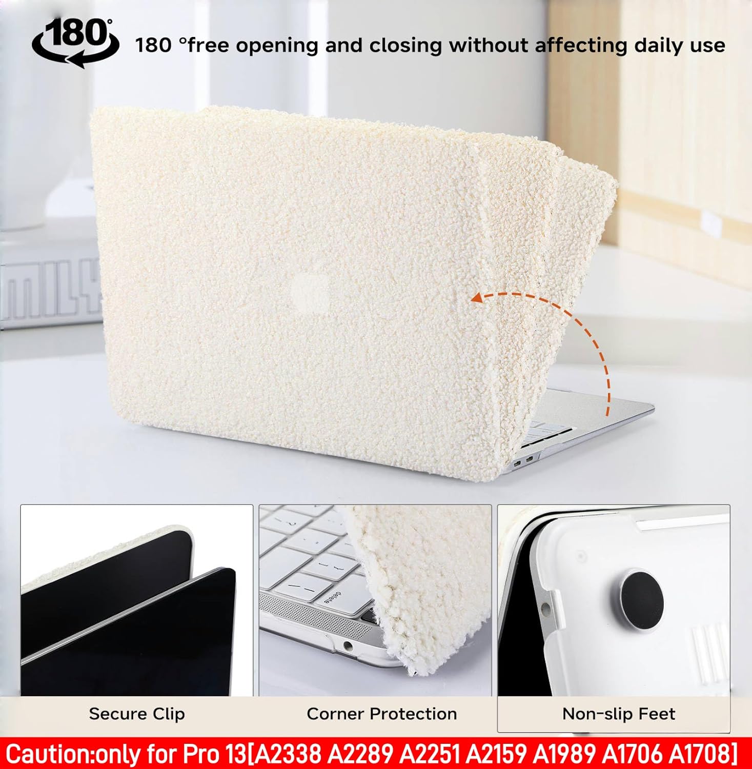 Compatibility - This soft fluffy laptop case will be compatible with MacBook Pro 13 inch with Touch Bar and Touch ID, 2024 2023 2022 2021 2020 2019 2018 2017 2016 release (models: M2 M1 A2338 A2289 A2251 A2159 A1989 A1706 A1708). WARNING: NOT compatible with other laptop models. Please kindly check the model number "Axxxx" on the back of the laptop before your purchase, make sure you choose the exact same model number as the listing title stated.