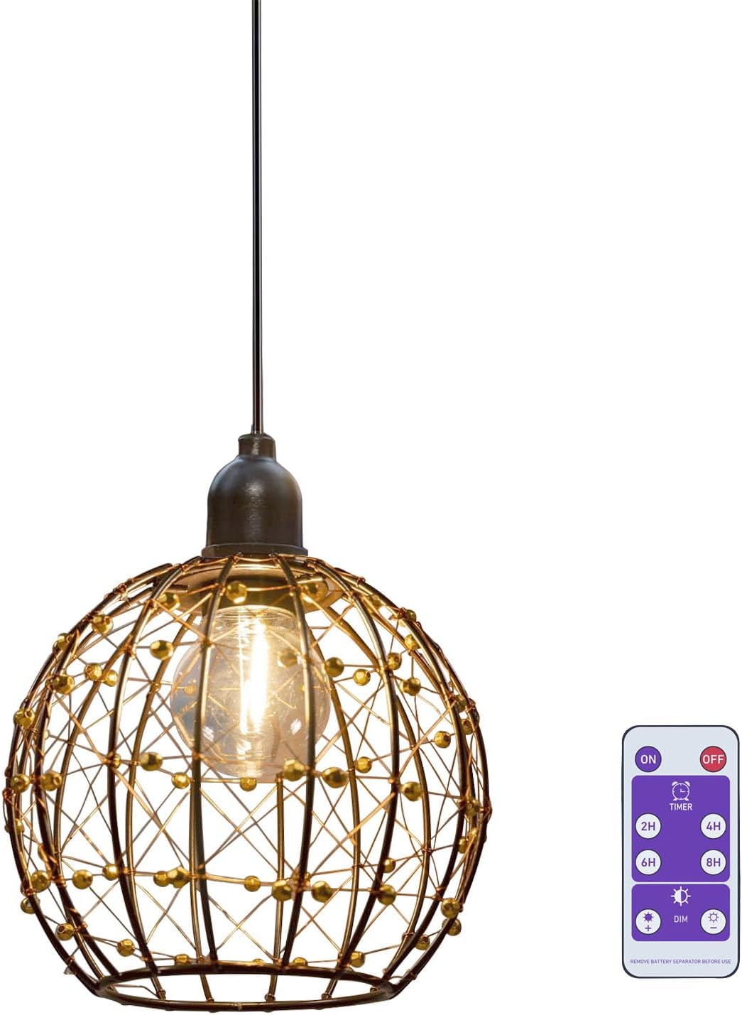 Battery Operated Pendant Lights Kitchen Island Decorative Chandelier for Gazebo Hanging Lamp with Remote Timer LED Bulbs Metal Globe Shade Lantern for Farmhouse Bedroom Porch Powered by 4*AA