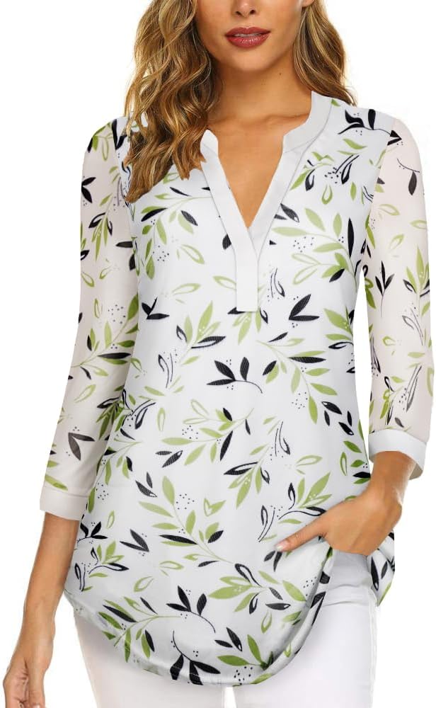 Supnier Womens Tops 3/4 Sleeve V Neck Dressy Blouses FLoral Print Layers Mesh Shirts Loose Fit Tunic Tops