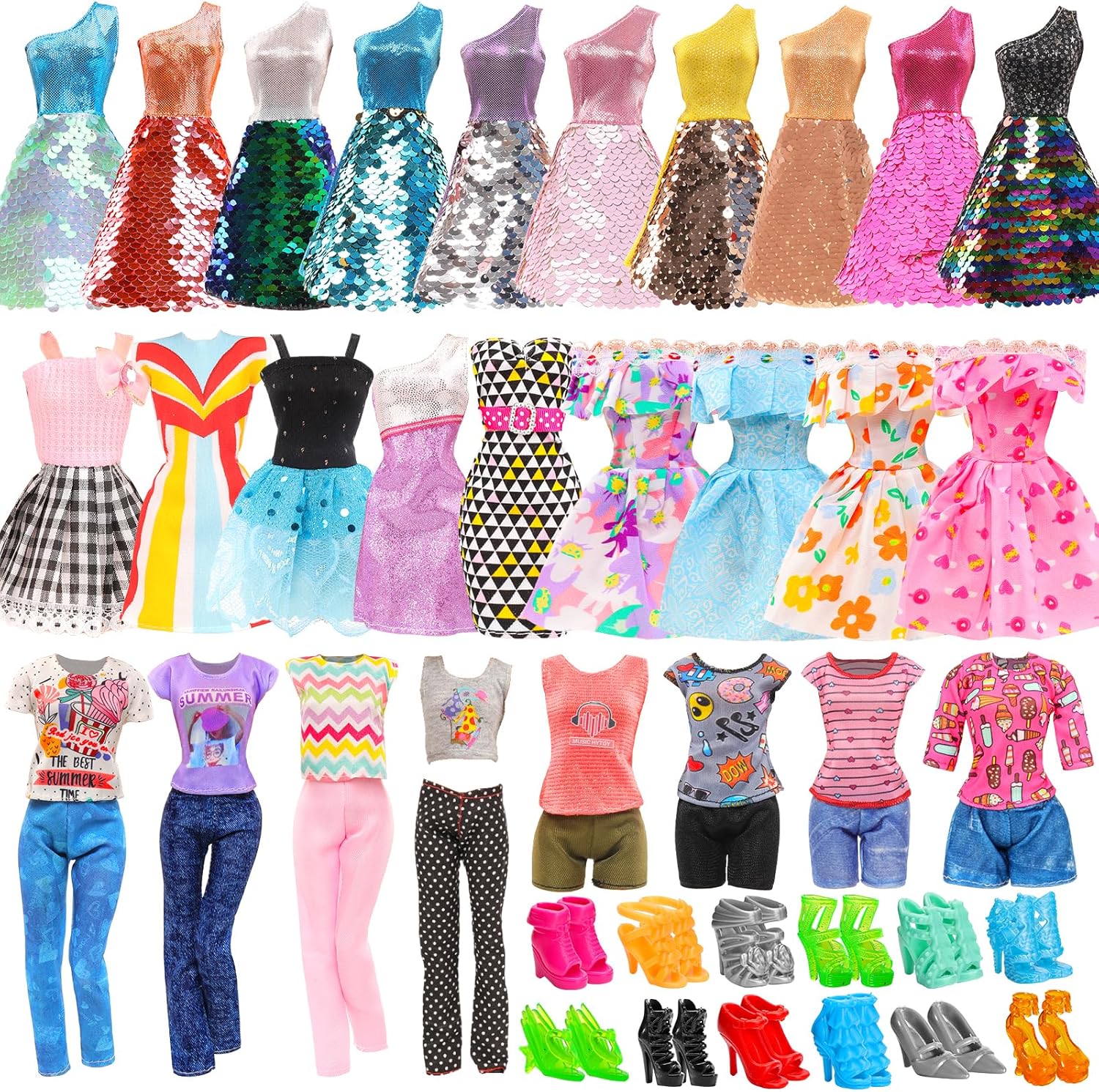 WHAT CAN YOU GET:23 PCS girl doll clothes and accessories for 11.5 inch girl doll,include 4 fashion dresses + 3 sequin dresses,3 tops and 1 long pant + 2 short pants,10 pairs of girl doll high heels shoes.