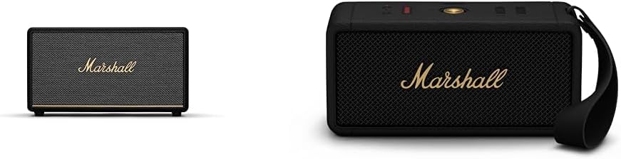 Marshall Stanmore III Bluetooth Wireless Speaker,BlackMarshall Stanmore II is the most versatile speaker in the Marshall line-up and is perfect for any room, big or small. It delivers on the promise of high-performance sound that is synonymous with the Marshall name. Stanmore II produces clean and precise Audio, even at the highest levels, due to advanced components such as two 15 watt class D amplifiers powering its tweeters and a 50 watt class D amplifier to drive its mighty subwoofer. With Bluetooth 5. 0 and Qualcomm aptX technology you can play your music in glorious, stereo sound with no wires required. Controls and Connectivity: Top Panel Controls Source button,Volume control knob,Bass control knob,Treble control knob,Play/Pause button,Power leveMarshall Middleton Portable Bluetooth Speaker, Black and BrassCarry the heaviest portable sound in your hand. Middleton has a quad-speaker set-up to ensure the ultimate immersive experience wherever you roam. Control playback and adjust the bass and treble using the top-mounted controls or the dedicated app. Built-in Dynamic Loudness adjusts the tonal balance of the sound to ensure your music sounds brilliant at every volume. Middleton utilises True Stereophonic, a unique form of multi-directional stereo sound from Marshall. Experience superior spatial and binaural sound that flows around you and fills any space. This is absolute 360° sound – where every spot is a sweet spot.Middleton is equally at home in the festival mud or on your polished sideboard thanks to its iconic yet durable design. With a rugged IP67 dust and water-resistant build, a bit of rain and dirt won’t get under its skin. Middleton’s sturdy build comprises 55% post-consumer recycled plastic and is completely PVC-free. This speaker drops you straight into your music with no trouble or fuss – just pair, play and enjoy 20+ hours of portable playtime on a single charge. When the power is drained, plug Middleton in for 4.5 hours to return to full battery. Keep the music going when your phone battery is low, charge your device on the move with Middleton’s trusty power bank feature. Middleton also connects to other Middleton speakers, amplify the sound with Stack Mode and discover a sound as big as your imagination. Stacked or solo, Middleton fills whatever space you’re in with colossal sound.
