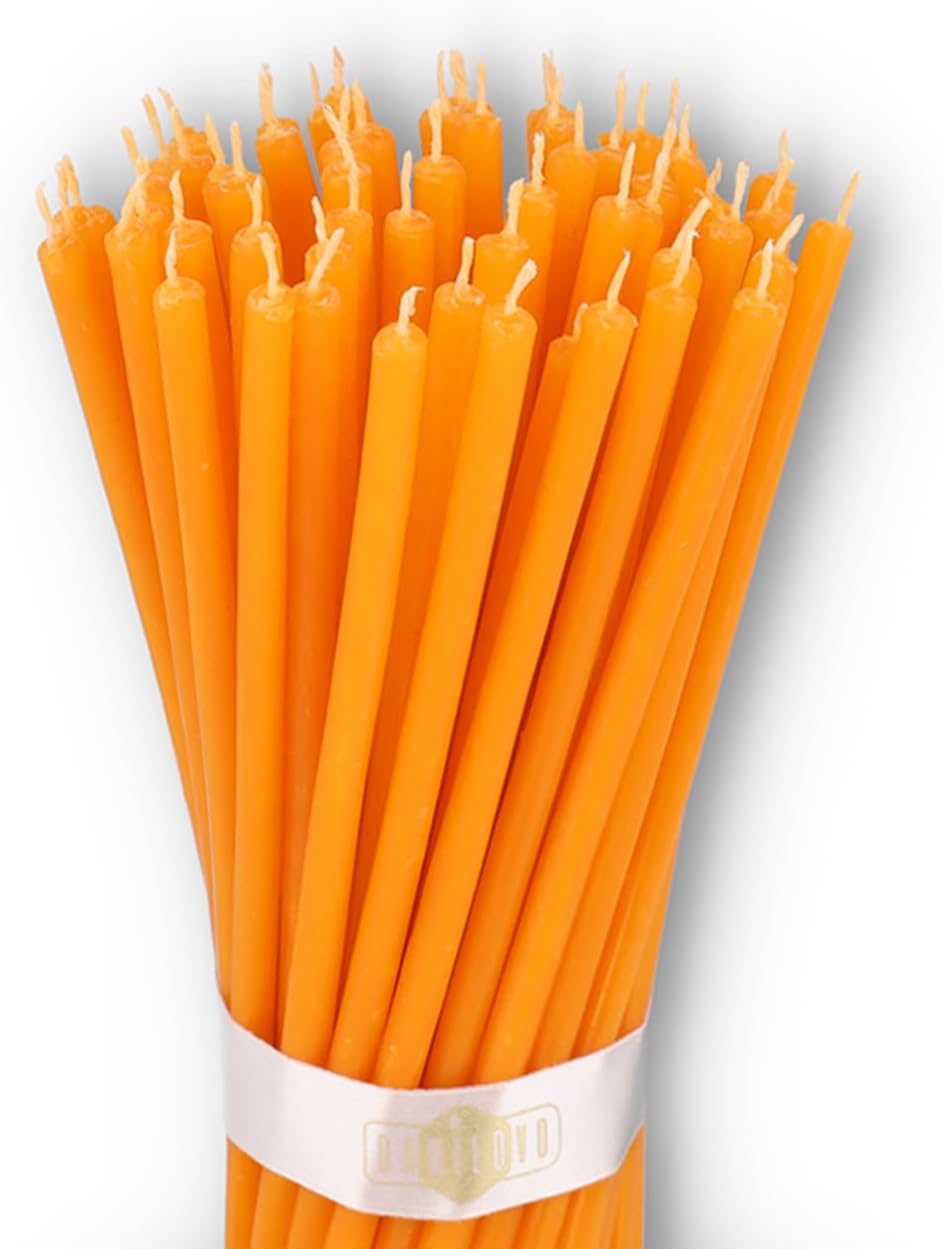 Danilovo Thin Taper Beeswax Candles - Honey-Scented, Decorative Candles Ideal for Birthday Decoration or Church Prayers - Orange Drip Free, Tall & Smokeless Pack of 50 pcs, 6.3 x 0.2 inch