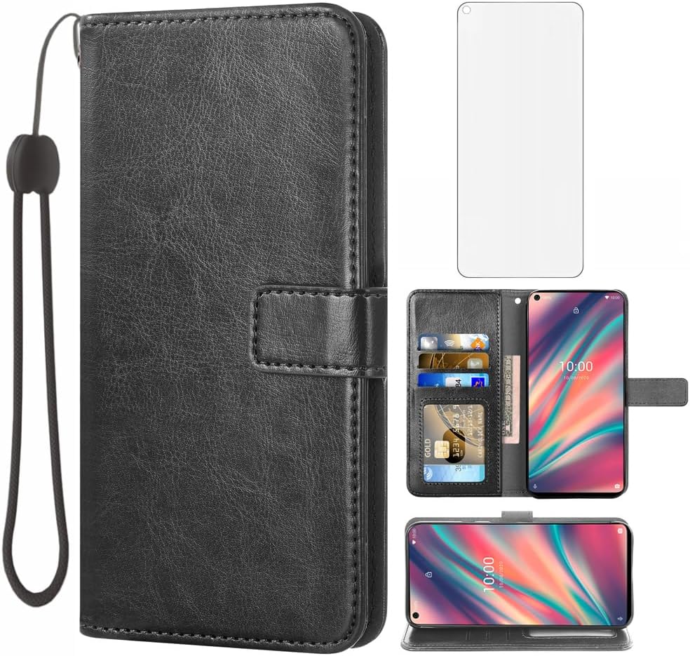 Asuwish Compatible with Wiko View 5 Wallet Case Tempered Glass Screen Protector Wrist Strap and Leather Flip Cover Card Holder Stand Cell Accessories Phone Cases for View5 Women Men Black