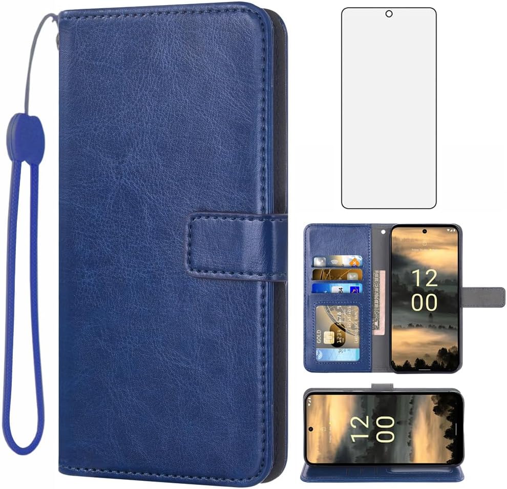 Asuwish Compatible with Nokia XR21 5G Wallet Case Tempered Glass Screen Protector Wrist Strap and Leather Flip Cover Card Holder Stand Cell Accessories Phone Cases for Women Men Blue