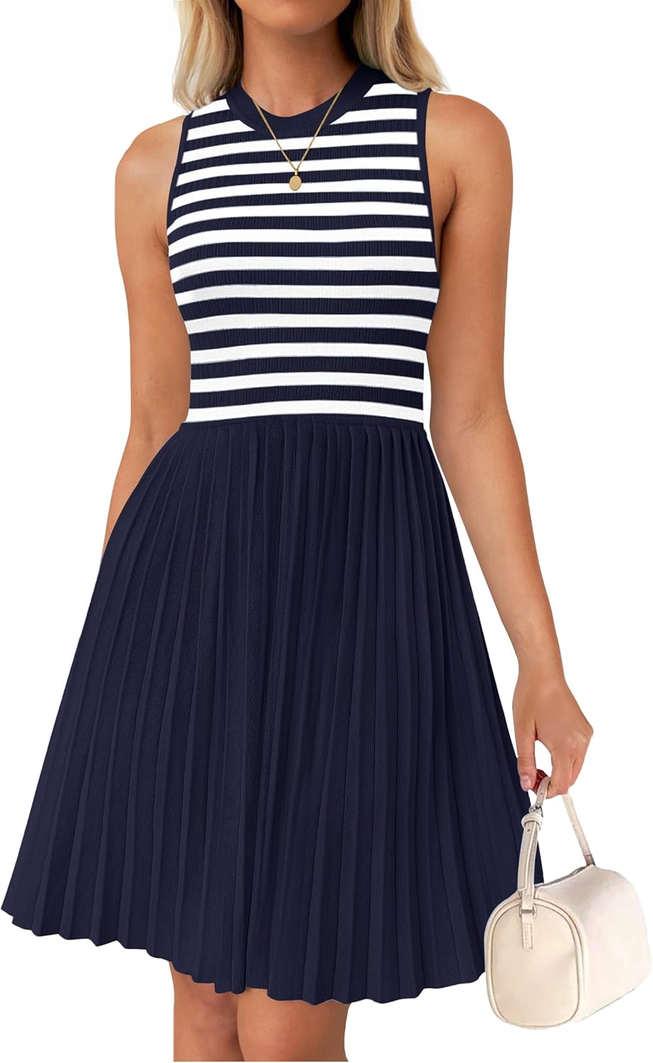 NENONA Women's Summer Sleeveless Mini Dress 2024 Crewneck Knit A Line Pleated Swing Casual Stripe Short Dress