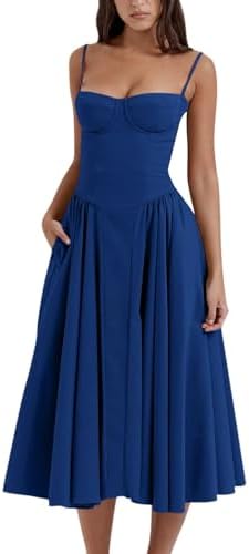 midelxp Womens Corset Dress Elegant Spaghetti Strap Bustier Midi Dress Low Cut Flowy Pleated Hem Formal Dresses with Pockets