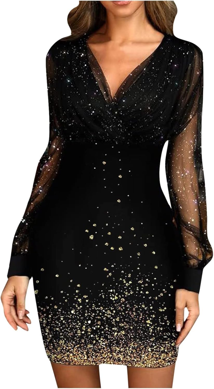 Women's Long Sleeve V-Neck Lace Printed Cocktail Prom Dresses