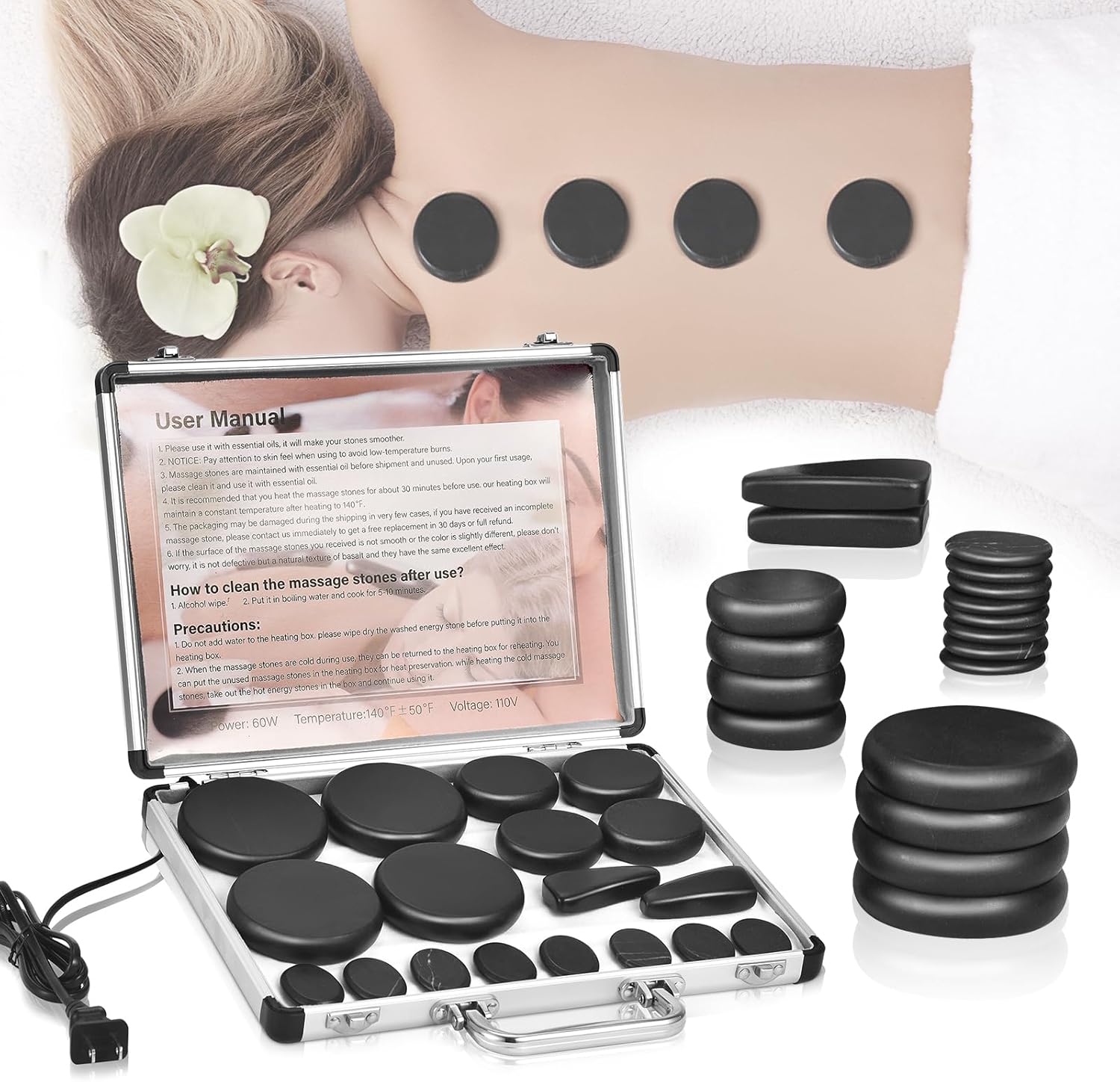 【Package Includes】4 hot stones measuring 2.36x3.15x0.8 inches, 4 round hot stones measuring 2.75x2.75x0.8 inches, 2 triangular hot stones measuring 1.18x2.57x0.8 inches, 8 hot stones measuring 1.18x1.57x0.23 inches, and 1 metal heating box measuring 30.5cm*21cm*4.5cm