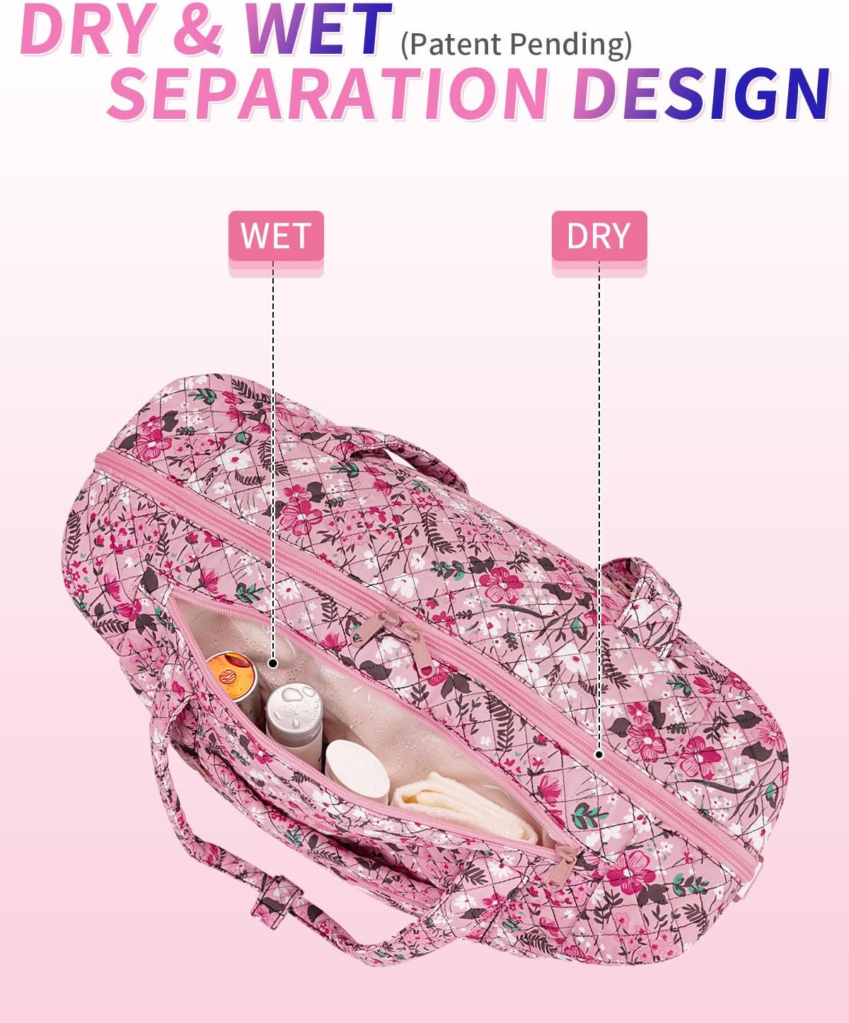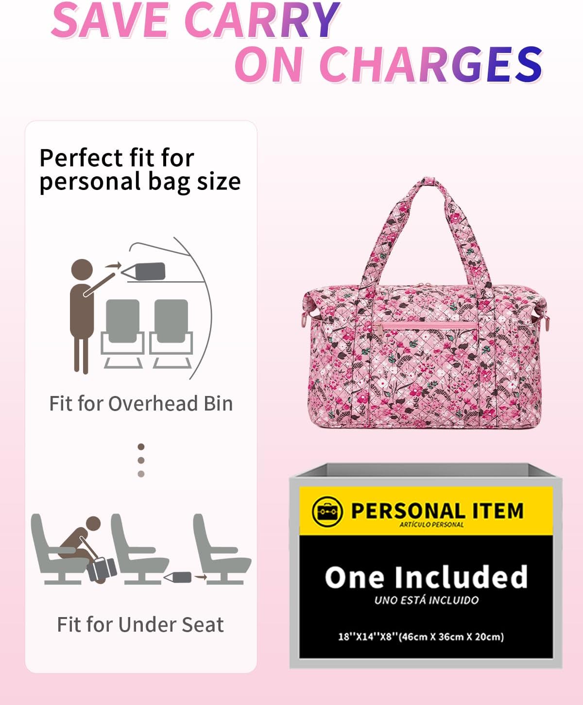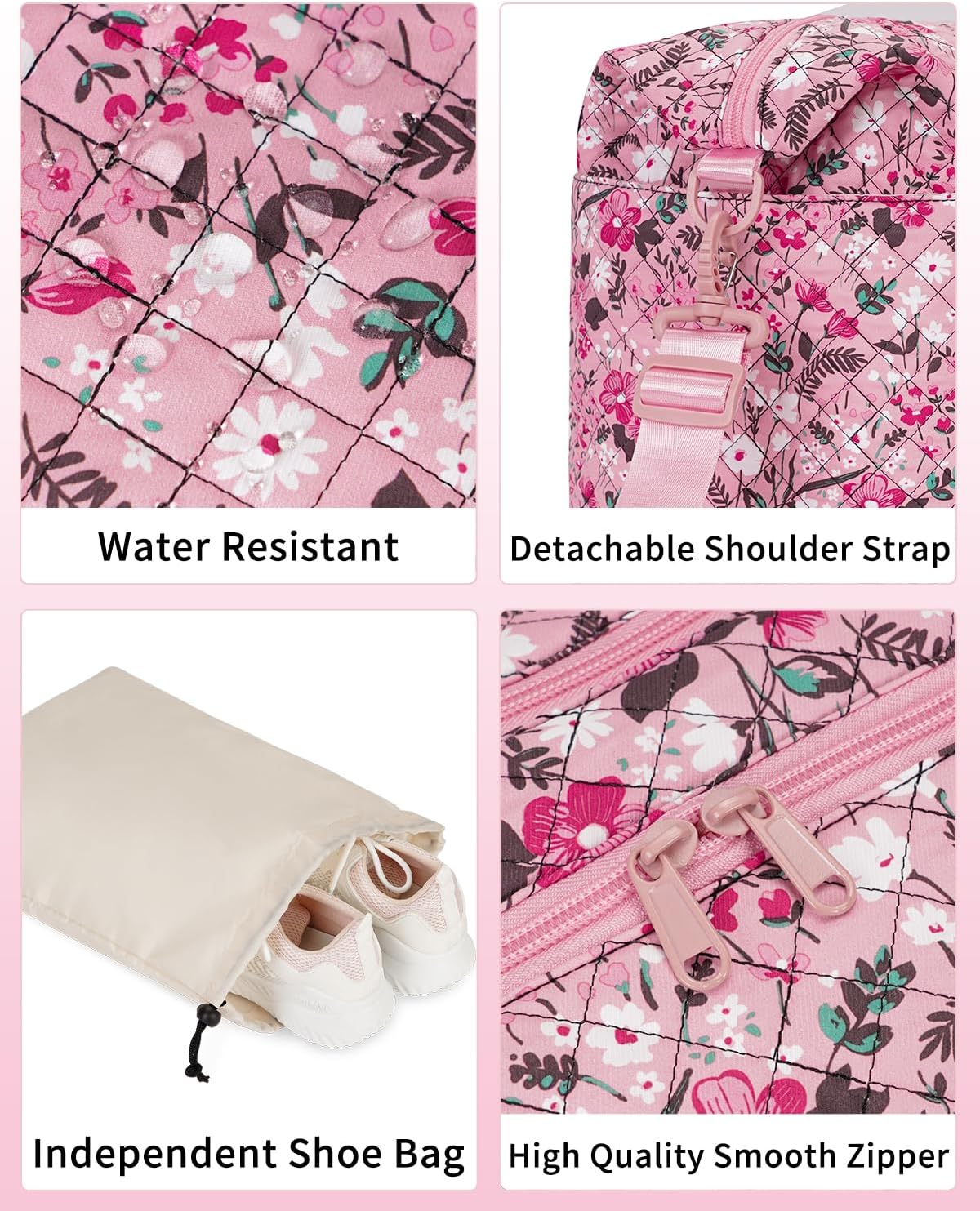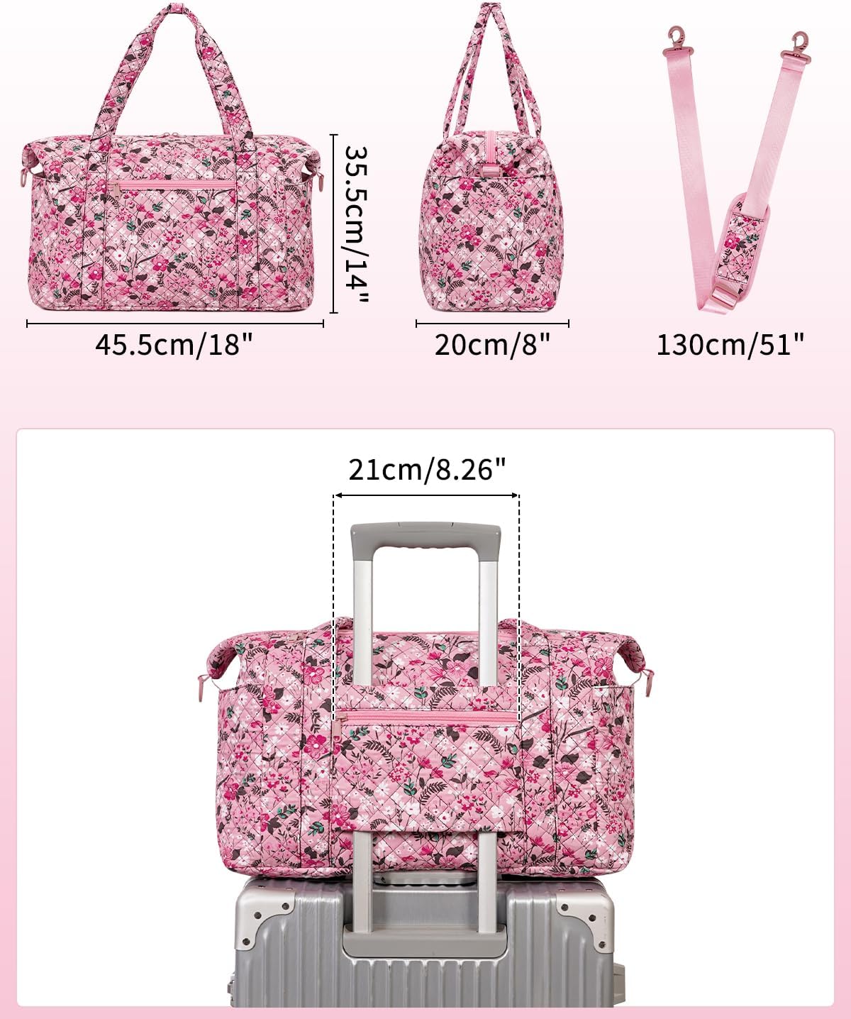 Ceneda Travel Duffle Bag - Quilted Weekender Overnight Bags For Women with Wet Pocket & Shoe Bag, Fits Airline Approved Personal Item Size (Pink Flower)