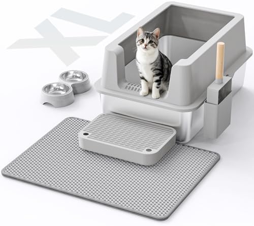 Stainless Steel Cat Litter Box - Enclosed XL Metal Kitty Litter Box with Lid for Big Cats, High Sided, Anti-Leakage, Easy Cleaning, Non-Sticky, Included Litter Mat, Cat Bowl & Spoon