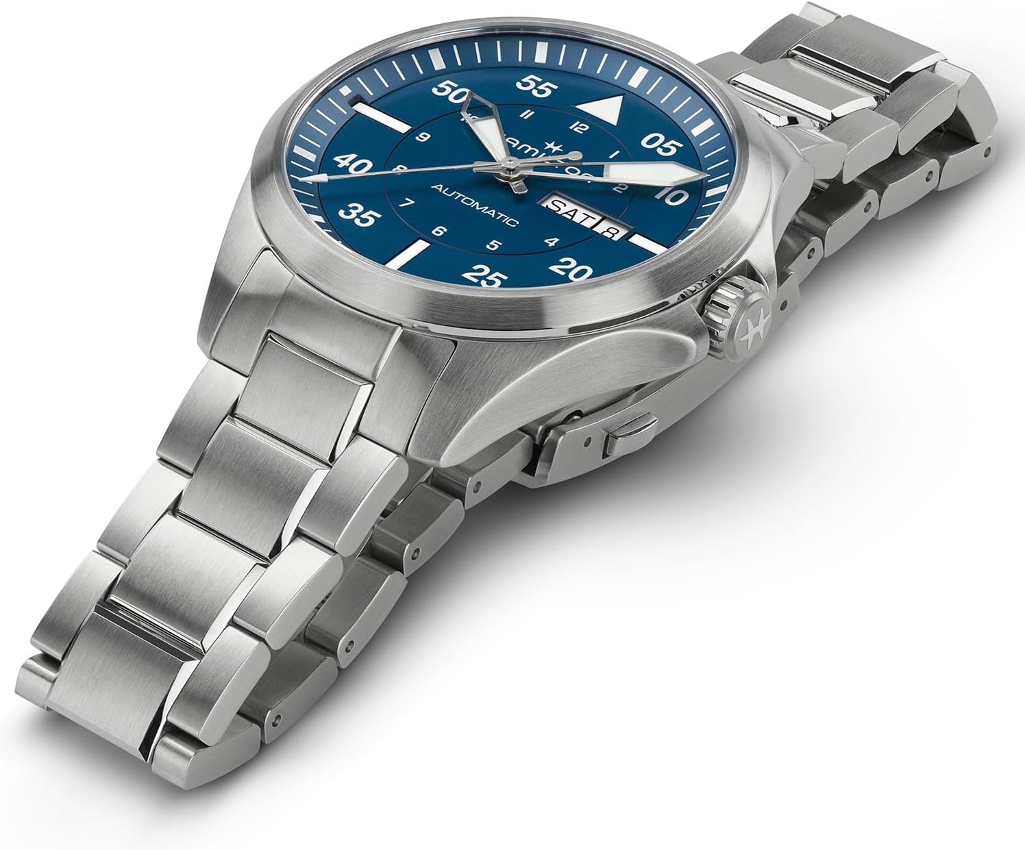 Crafted for true aviation lovers, the Khaki Aviation Pilot Day Date evokes the spirit of exploration and adventure of the Khaki. Powered by the H-30 automatic movement with an 80-hour power reserve and Nivachronâ„¢ balance spring, this model features a day-date window and enlarged numbers on the dial for greater legibility. The Khaki Aviation Day Date 42mm sits on a cool, stainless-steel bracelet, paired with a rich blue dial, conjuring the possibilities of clear, open skies.