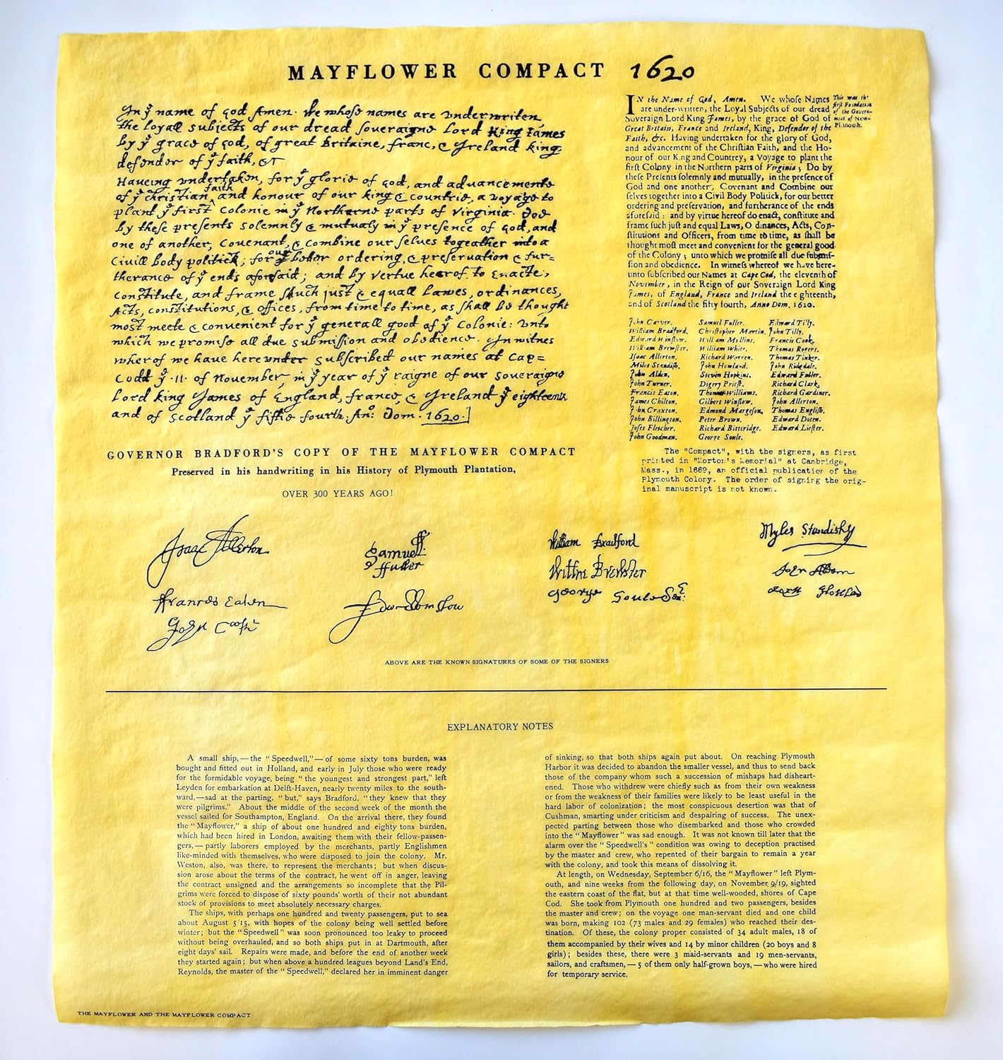 This authentic replica of "Mayflower Compact 1620" is the perfect addition to any history collection. Can keep in its clear plastic collectors tube or have it framed...it will be a real conversation starter! Of the 102 passengers aboard the Mayflower in 1620, 41 men signed the Mayflower Compact, meant to establish in writing the intentions and obligations as new residents in the land of freedom. The Compact, itself only one paragraph long, is replicated here in Governor Bradford's handwriting. The document also features signatures, explanatory text and interesting historical facts about the Mayflower and its brave passengers.