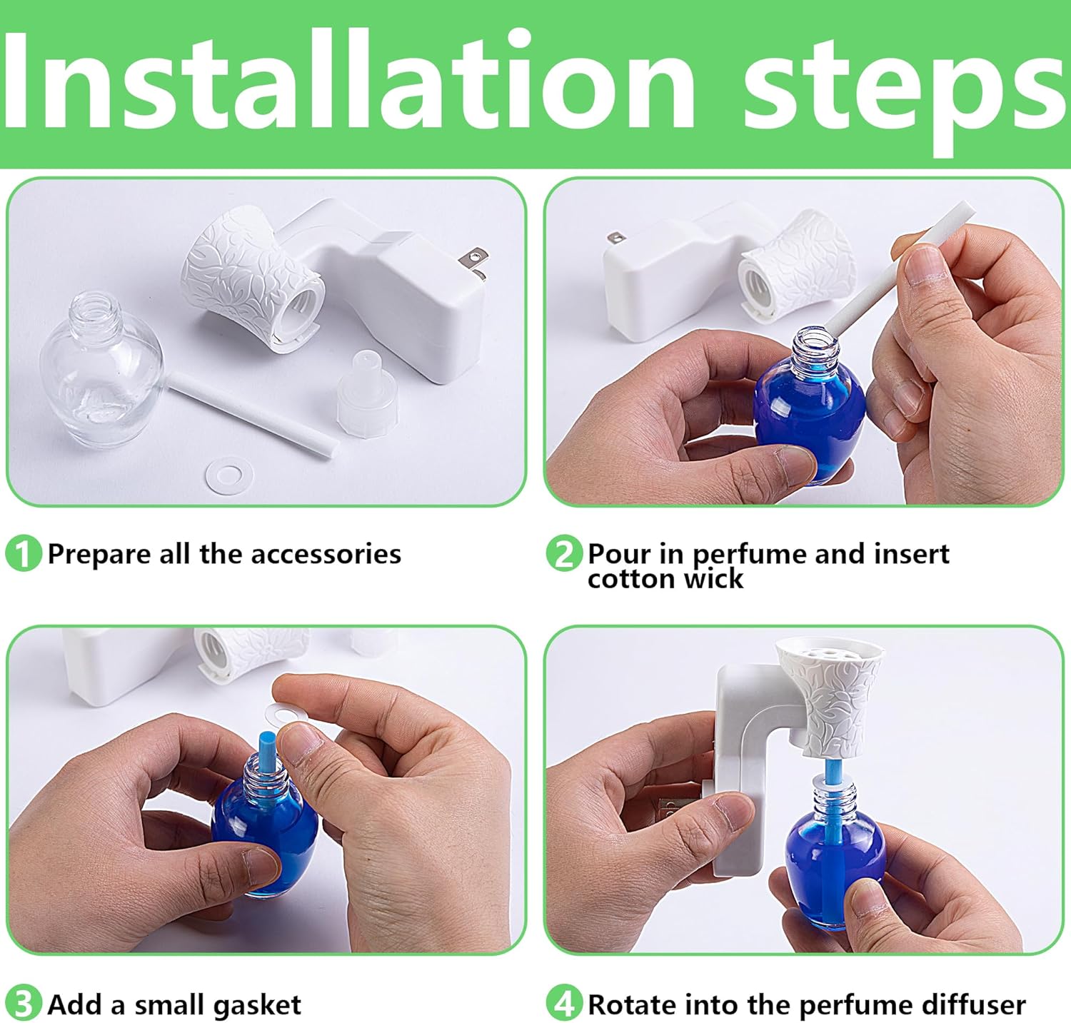 Easy to Use: First step put the fragrance you like in the bottle, the second step rotate counterclockwise to the left, thrid step keep plug in diffuser in an upright position, ensure that the fragrance won't spill out.