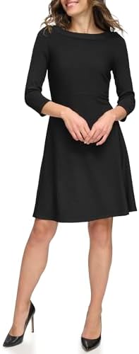 This Tommy Hilfiger Women's Dresses Dress is a 3/4 Sleeve Silky Rib Knit Boat Neck Button Shoulder Knee Length Fit and Flare Dress