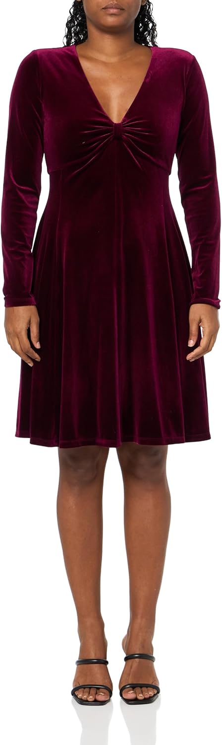This Tommy Hilfiger Women's Dresses Dress is a 3/4 Sleeve V-Neck Stretch Velvet Bow Detail Fit and Flare Dress