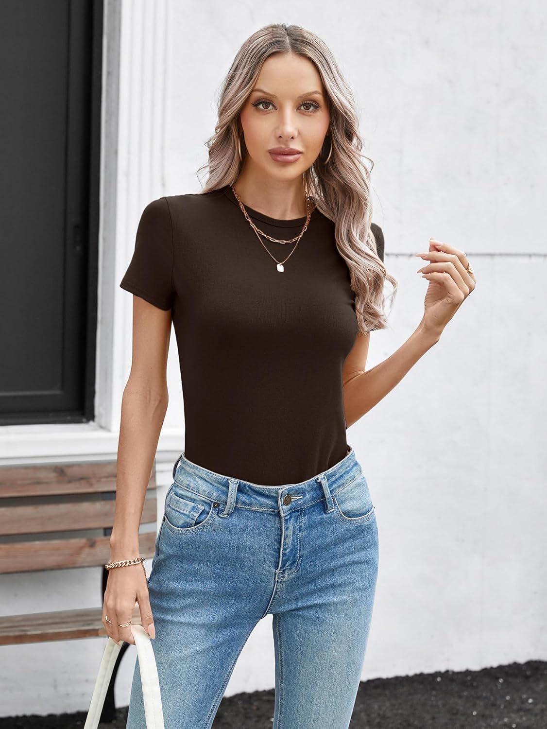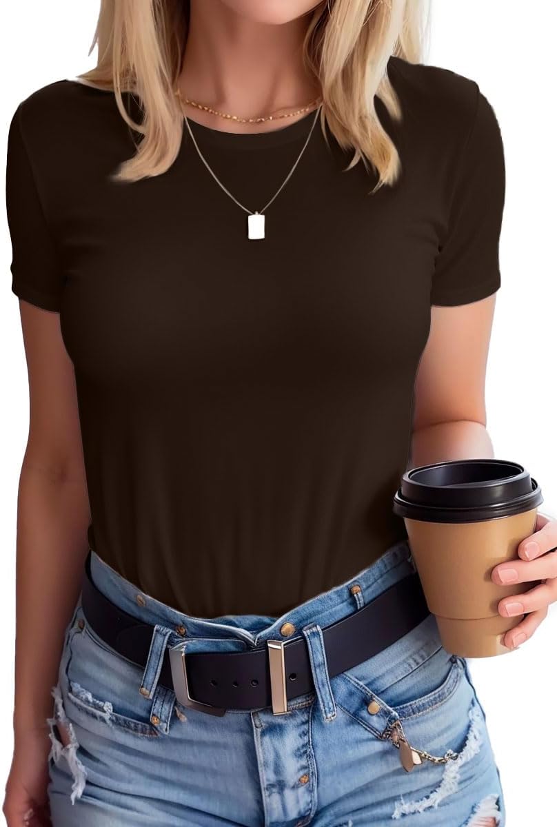 SANDERY Womens Round Neck Long/Short Sleeve Shirts Ribbed Casual Slim Fitted Tops Blouses