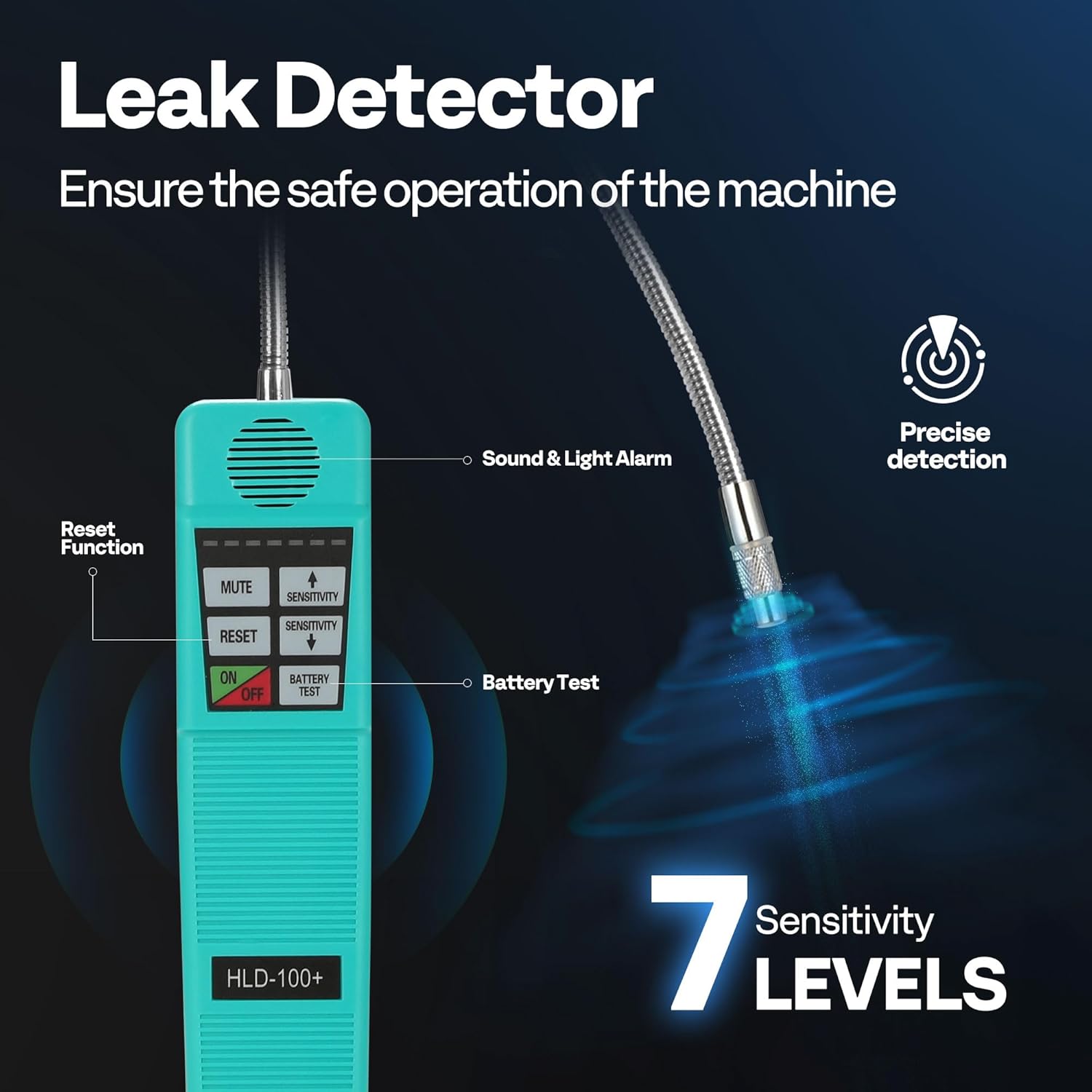 PRECISE GAUGE AND LEAK DETECTION: The manifold gauge set ensures accurate and timely monitoring of pressure levels, allowing you to observe the refrigerant flow and assess its condition through the sight glass; The leak detector efficiently identifies most refrigerants, aiding in pinpointing leak locations and enhancing maintenance efficiency; This pump and gauge set is perfect for servicing air conditioning systems, compatible with R134a, R12, R22, and R410a; Note: The leak detector requires 2 C batteries (not included)