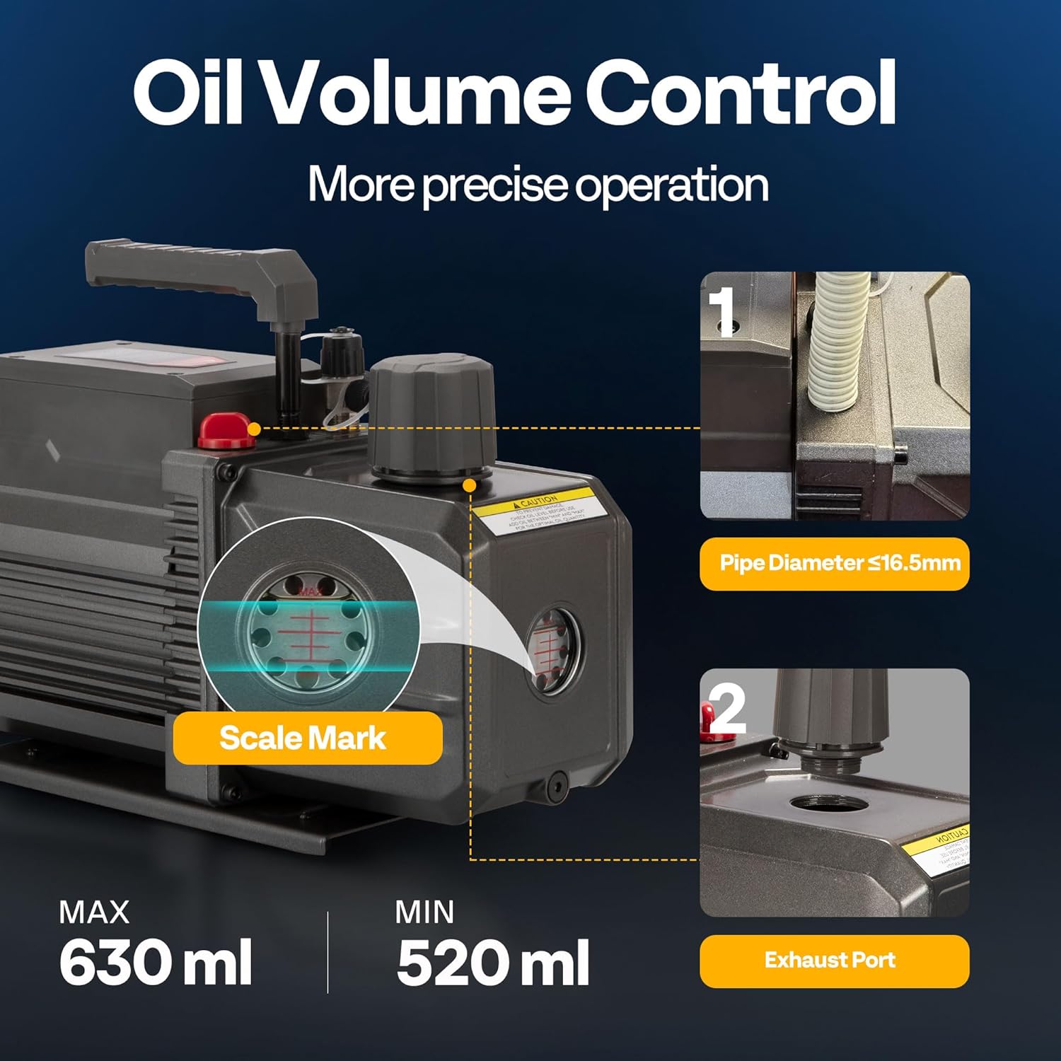EFFICIENT AND THOUGHTFUL DESIGN: This pump is equipped with a coarse filter at the inlet port to prevent dust particles from entering the chamber; Additionally, it features a filtration device at the exhaust port, separating oil mist from exhaust gas to enhance work efficiency and reduce noise to below 70 dB; Effortlessly refill the pump by unscrewing the grey exhaust cap; Also, you can replenish oil through the red bracket oil inlet, pouring directly or using a tube to keep your hands clean