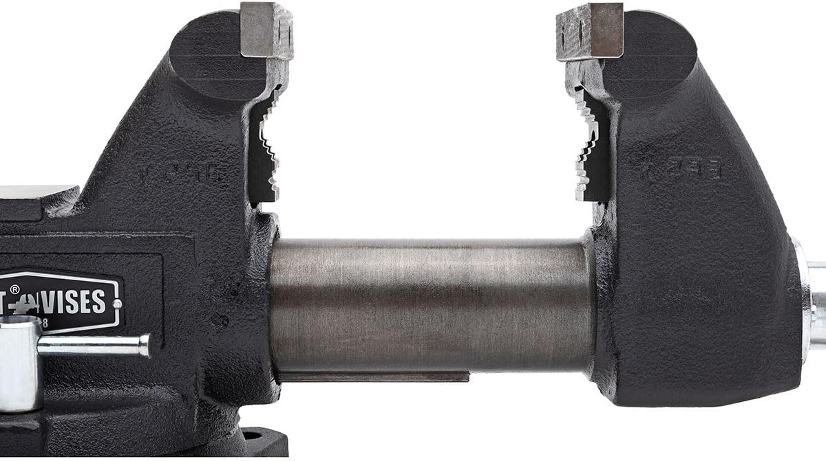TECHNICAL SPECIFICATIONS: This heavy-duty workbench workshop vise is designed for performance and long-lasting durability that lasts for years of heavy usage, Equipped with a secured interlocking swivel base and impressive 4.52" Jaw Width, 4.50" Maximum Jaw Opening, and a Throat depth of 3.61" offering versatility and convenience for various projects. Its maximum jaw clamping force of 7868 lbs. ensures secure and precise clamping allowing you to tackle diverse projects with confidence and ease.