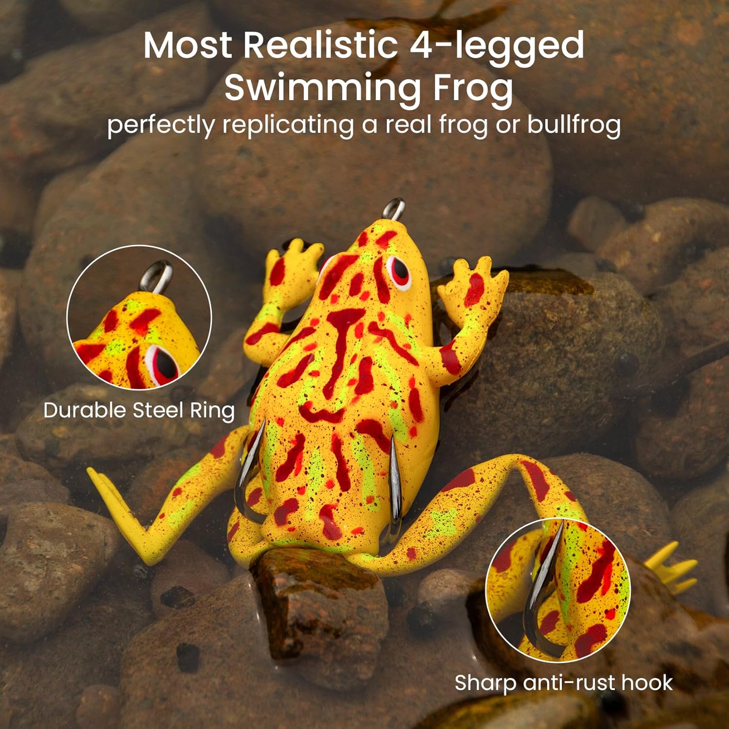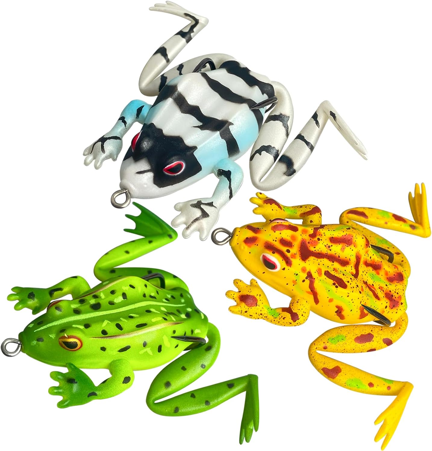 Weedless Hollow Body: The ultra sharp hooks are embedded into the frog's belly, and flexible hollow body allows hooks to be better exposed when fish attack. With the weedless design, this bass fishing frog can easily navigate through heavier coverings