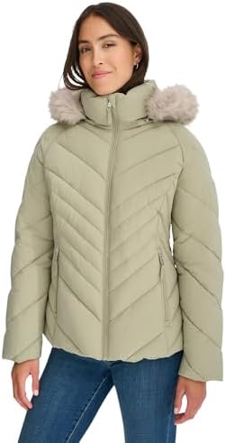 Elevate your outerwear wearing the Tommy Hilfiger Faux Fur Trimmed Short Puffer. Featuring faux fur removable trim on hood, chevron quilting, zippered front closure, long sleeves perfect for cool/cold weather. This short length jacket has two front hand pockets with zippered closure. 100% polyester. Machine washable.