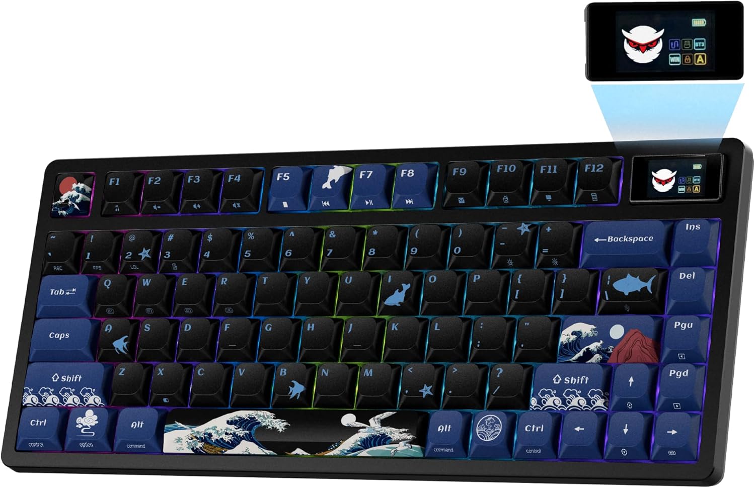 XVX 75% Keyboard with Color Smart Display, L75 Pro Low Profile Gasket Mechanical Gaming Keyboard, Bluetooth 5.1/2.4G Wireless/Type-C Wired Custom Anime Key board with RGB Backlit, Black Kanagawa Theme