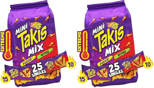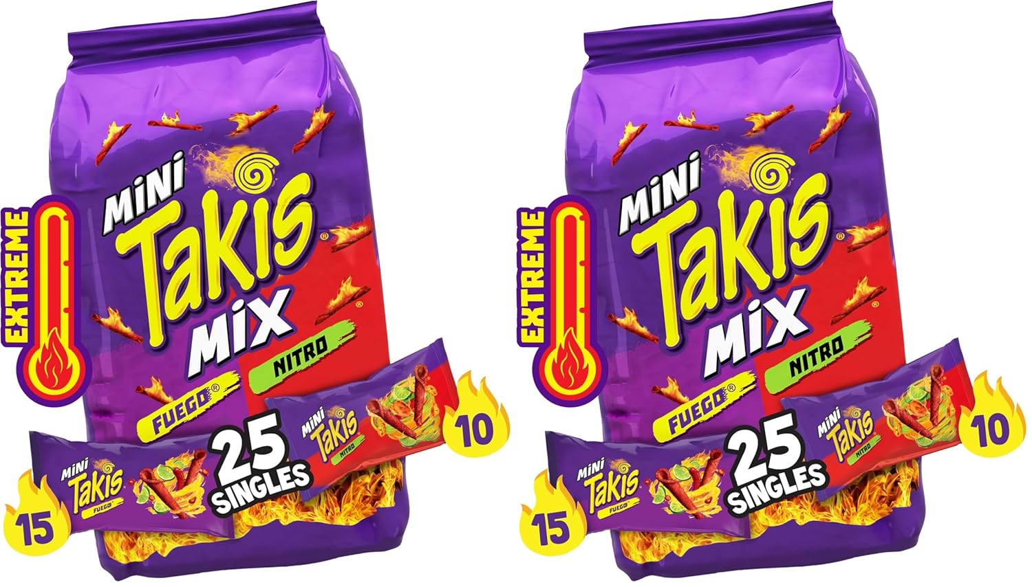 Takis Mini 25 pc / 1.23 oz Bite Size Variety Pack, Assorted Flavored Mixed Rolled Tortilla Chips – (15) Fuego Mini 1.23 oz, (10) Nitro Mini 1.23 oz (Pack of 2)