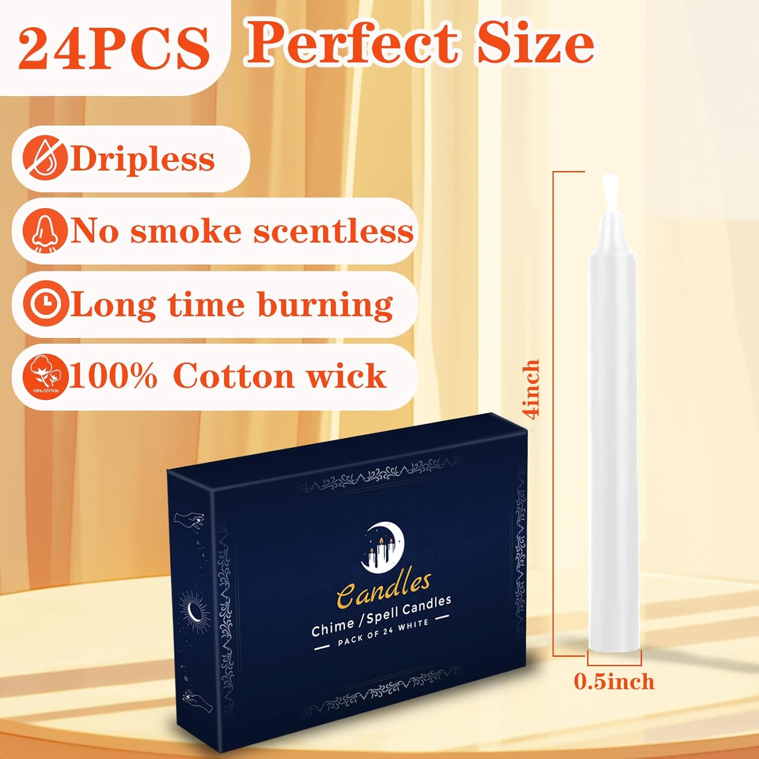 Burn Time: The spell/chime White candles set includes 24 candles odorless candles that are 4 inches tall and approximately 0.45 inches wide, suitable for most candle holders, ensuring up to 2 hours of continuous burning.