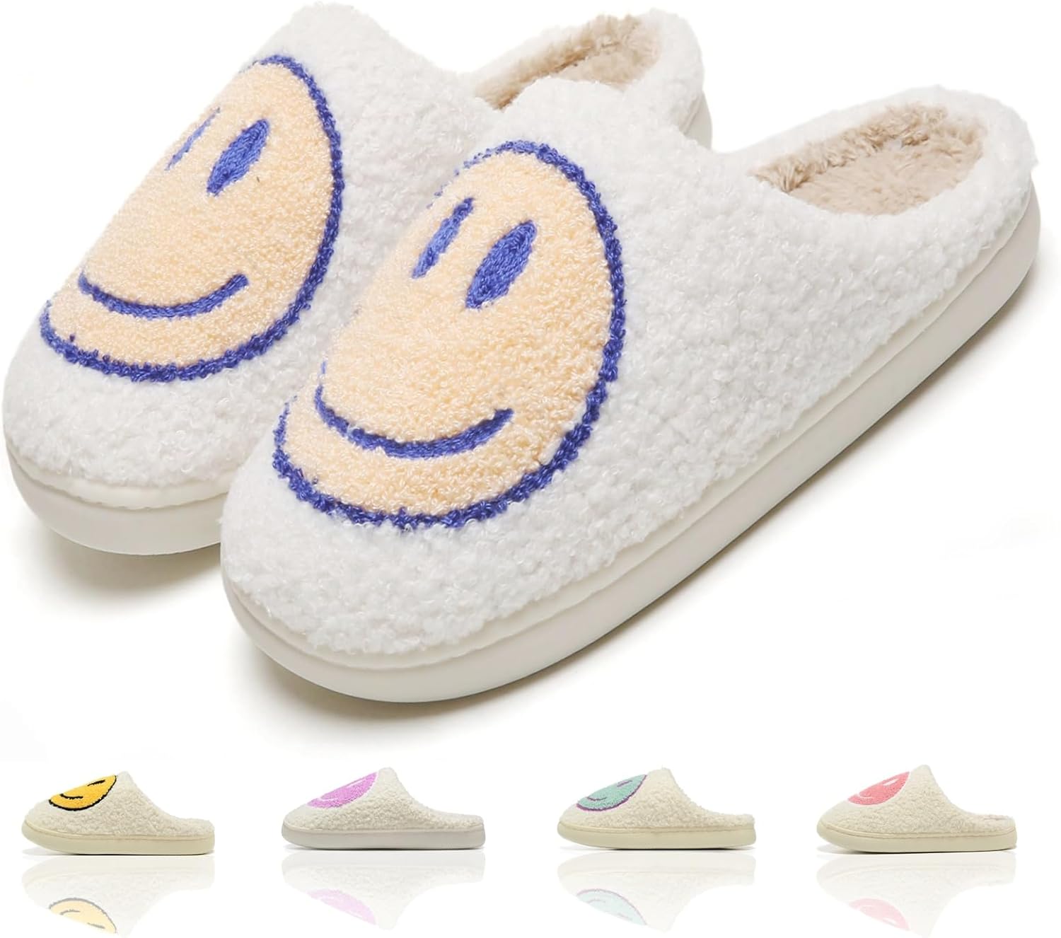 Cute House Slippers for Women Men with Memory Foam Retro Happy Face Cozy Indoor Outdoor Fuzzy Plush Shoes
