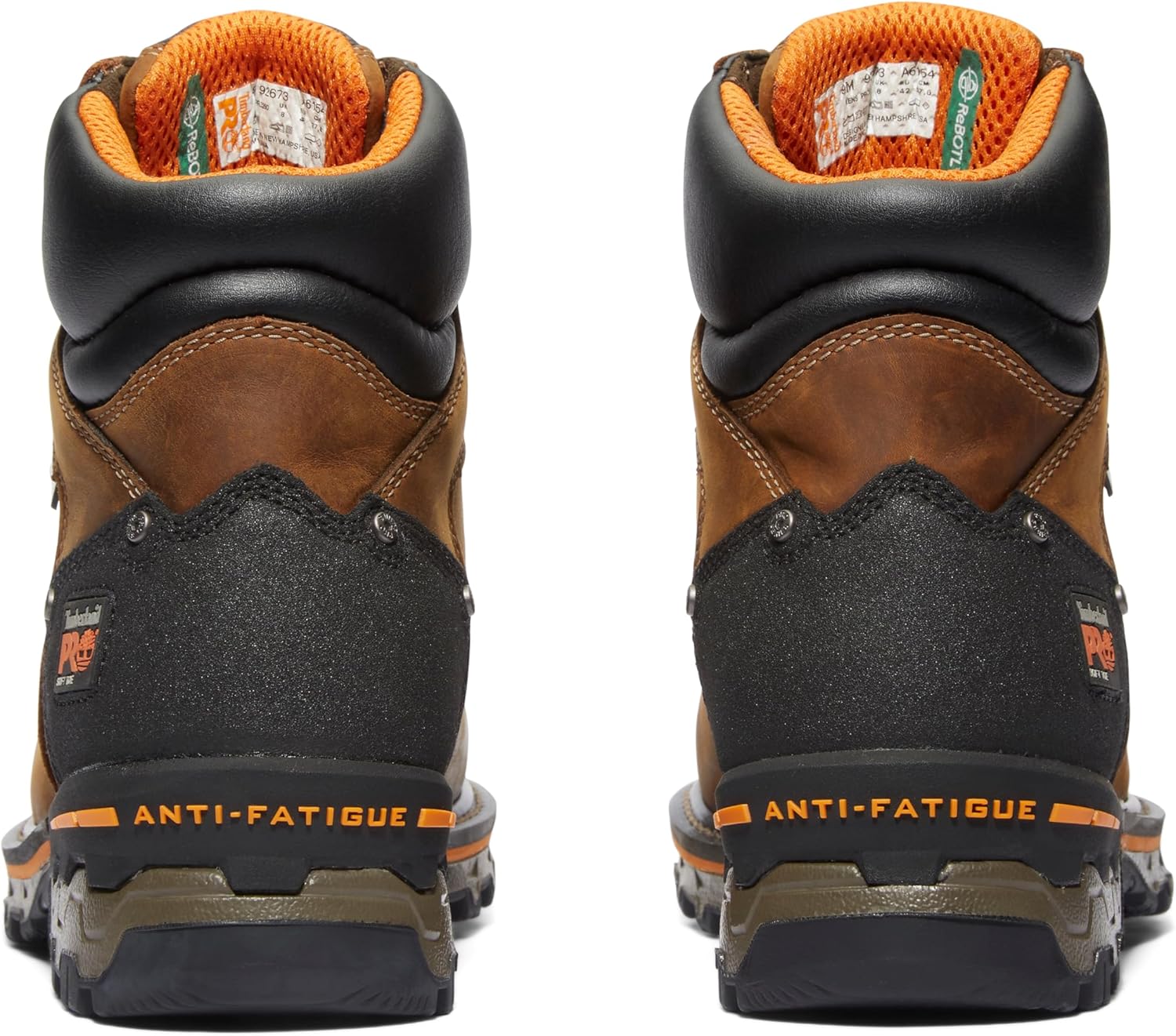 We designed our heavy-duty Boondock manufacturing boots to provide industrial-grade protection from every angle. Starting with their Premium Timberland waterproof leather uppers with internal waterproof, breathable membranes for maximum waterproof protection, we added our molded Timberland PRO rubber toe protectors that are as thick as standard boot outsoles, rigid external heel cups to support lateral movement, and our Anti-Fatigue Technology footbeds for all-day shock absorption and energy return. You'll also find protection from below with our heat-, slip-, oil, and abrasion-resistant, non-marking, lightweight, All-Weather TPU outsoles that offer enhanced traction in extreme environments. Plus, their breathable, moisture-wicking linings are made of ReBOTL fabric containing at least 50% recycled plastic.