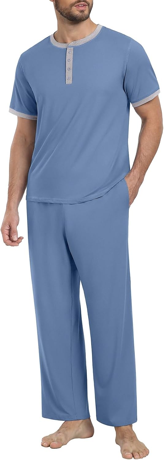 PrinStory Men's Pajama Set Pjs Sleepwear Lightweight Quick Dry Cozy Short Sleeve Button Neck Shirts and Pants Soft Sleep Sets