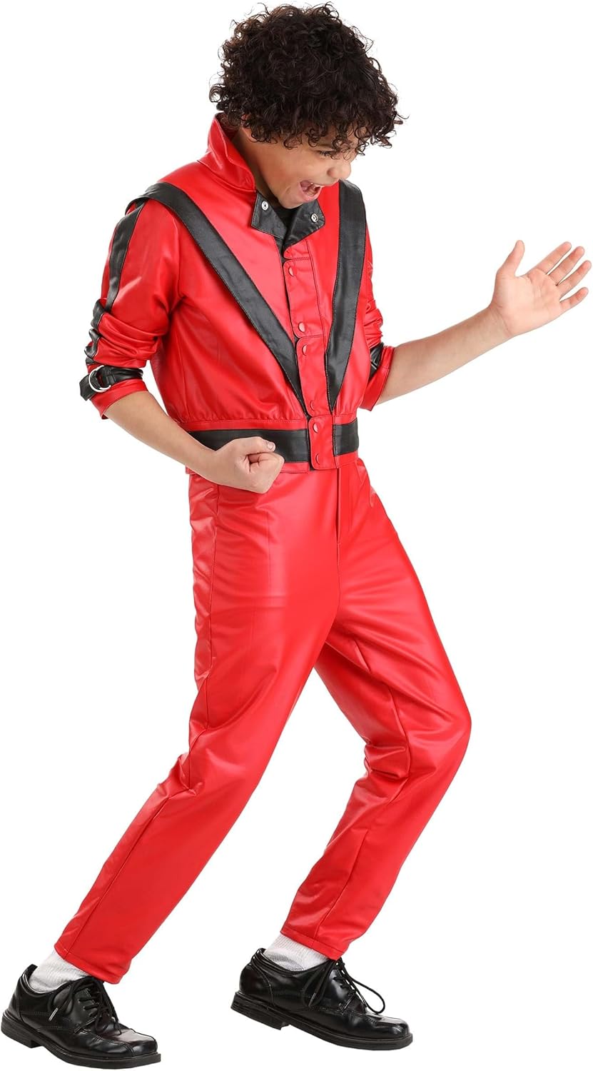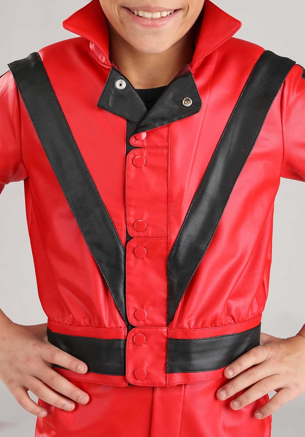 Let your child channel the energy of the King of Pop with the Kid's Michael Jackson Thriller Costume! Perfect for Halloween, themed parties, or even daily dress-up, this officially licensed red tracksuit is an iconic look straight from the legendary "Thriller" music video. With its bold red and black faux vinyl jacket, your little star will feel like a true pop sensation. The soft lining of the jacket ensures comfort for all-day wear, while the metal snaps down the front add that classic Michael Jackson style. Whether they're striking a pose or dancing to the beat, this Kid's Michael Jackson Thriller Costume is made for moonwalking into the spotlight. Designed for both style and movement, the Kid's Michael Jackson Thriller Costume includes matching red stretch faux vinyl pants, perfectly fitted with elastic bands on the sides of the waist. This allows for plenty of flexibility as your child shows off their dance moves. The pants also feature practical belt loops and a faux fly, creating a polished, finished look. The black faux vinyl accents and adjustable metal D-rings on the jacket cuffs give the entire outfit an authentic, stylish edge, making it the ultimate Halloween outfit or dress-up option for any young Michael Jackson fan. Get your little one ready to embody the pop star legend with this red Michael Jackson tracksuit! From the 94% polyester and 6% spandex blend jacket to the soft lined pants, every detail of this Kid's Michael Jackson Thriller Costume captures the magic of the iconic music video. The officially licensed outfit ensures that every part of the design stays true to the original, making it a must-have for any young fan who dreams of dancing like the King of Pop. Includes: Jacket - Pants - Jacket - Pants