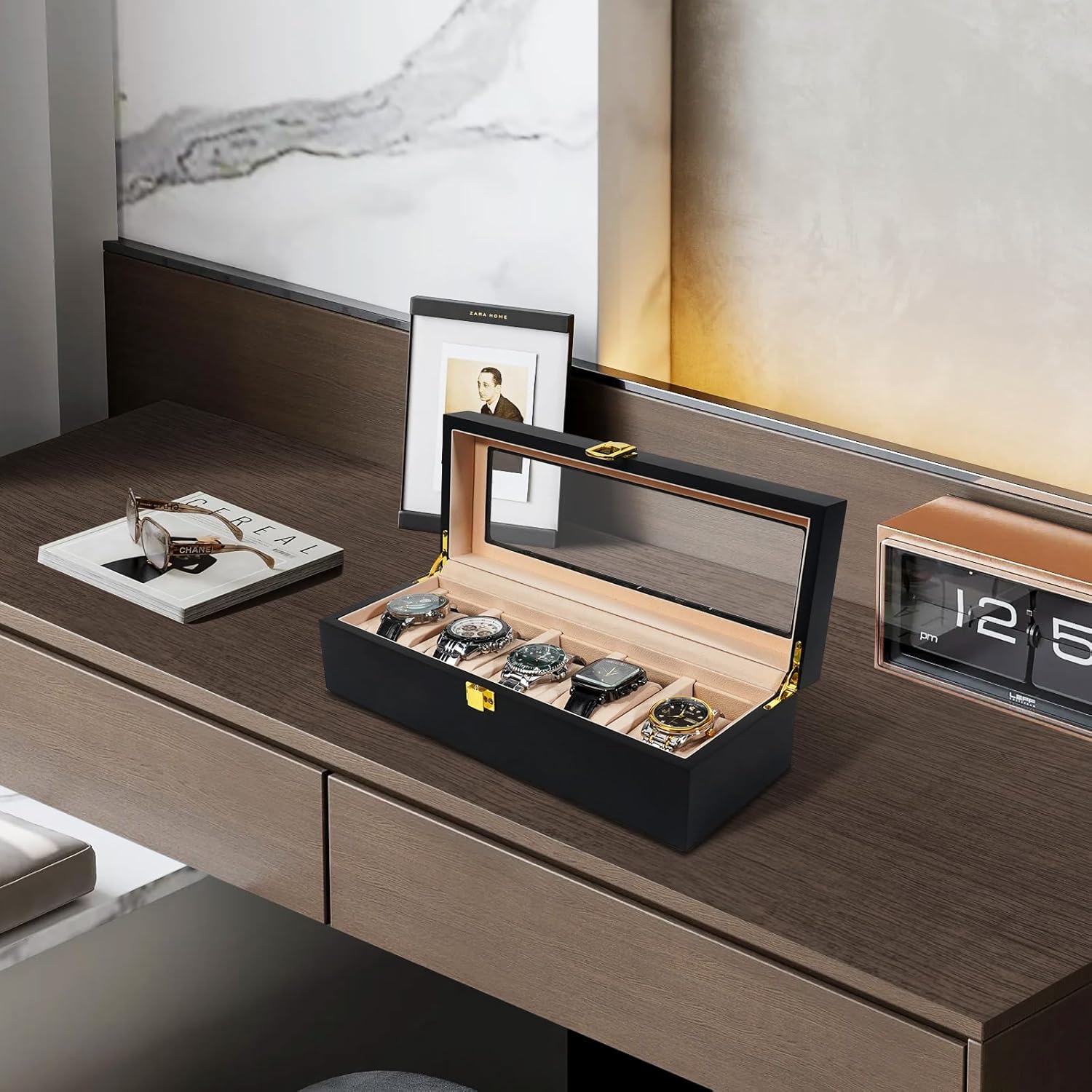 Wooden Watch Storage Box - 5 Slot Watch Display Case for Men Women | Watch Holder Organizer fit Watches with Dial Size up to 52 mm Black