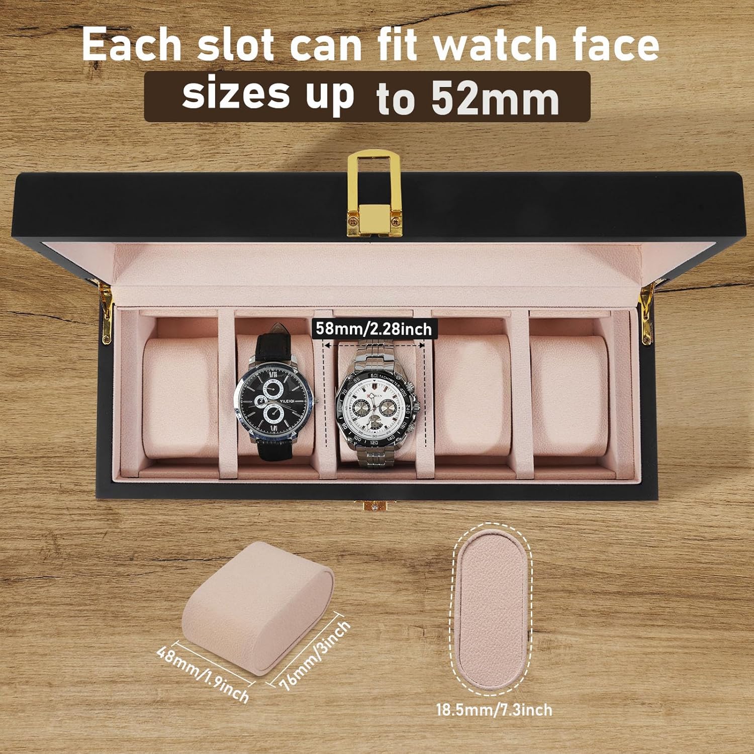 Fits various watches with diameter up to 52 mm -- Our upgraded 5 slot watch box offers enough space for your watch collection. Each slot is spacious and can fit different type of watches with dial size up to 52 mm. The perimeter of the watch pillow is 7.3” (18.5 mm), please confirm that if the watch pillows fit your watches.