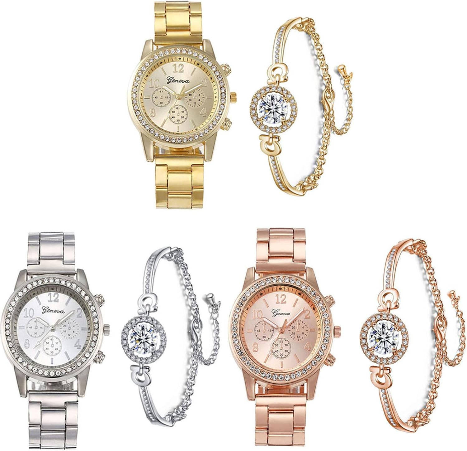 3 Pcs Elegant Diamond Watches and Bracelet Set for Women Classic Round Dial Rehinestore Bezel Analog Quartz Ladies Watches