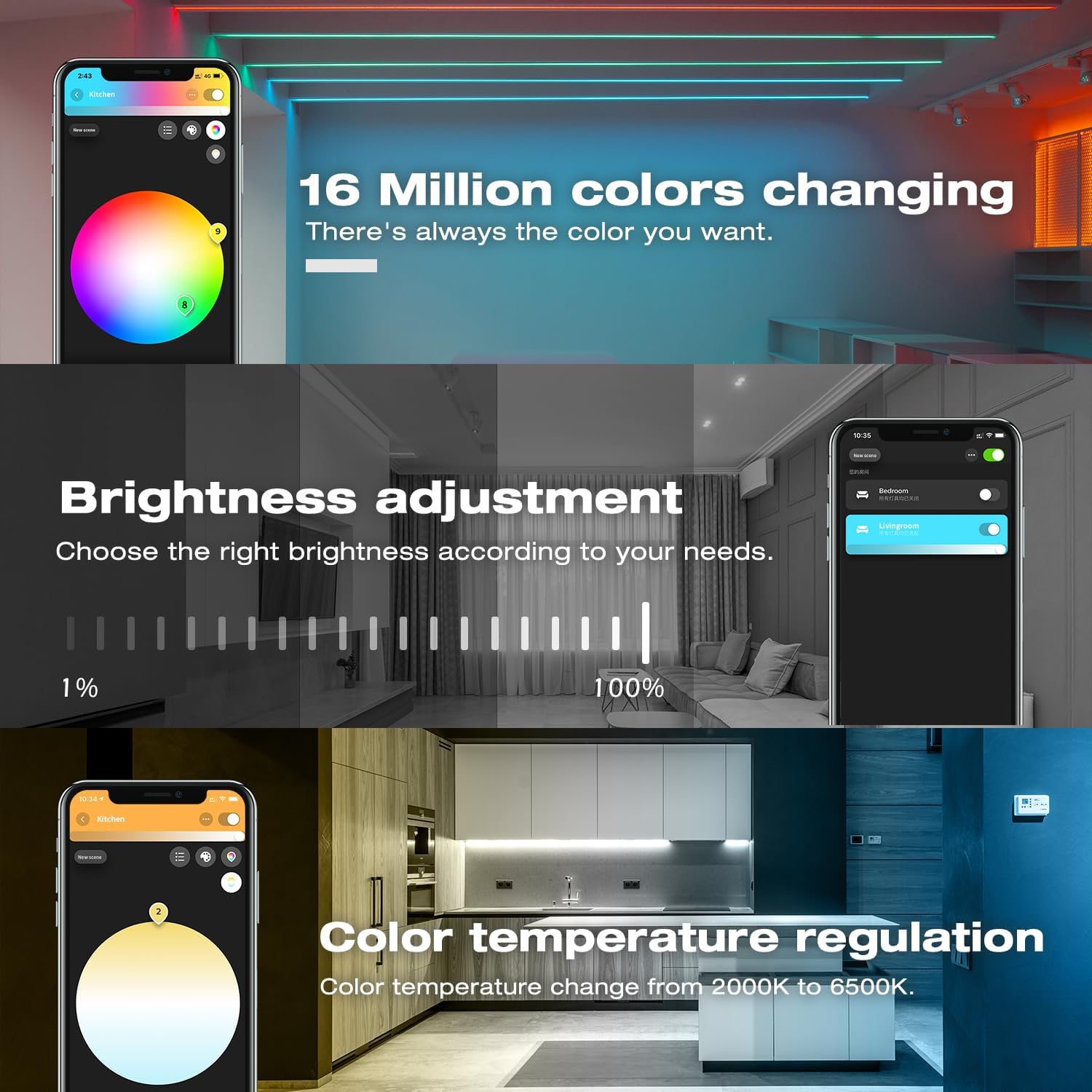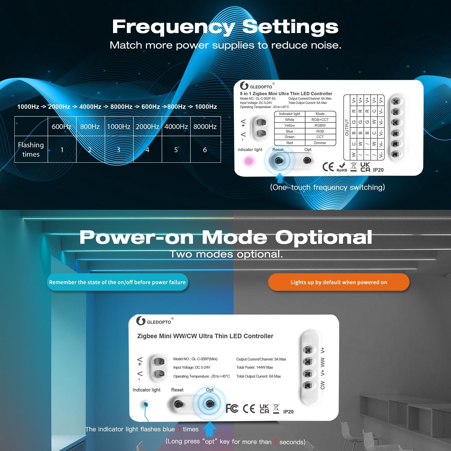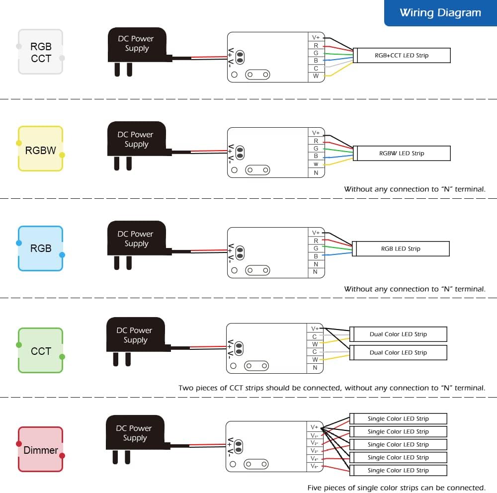 5 in 1 Five Modes: There has five modes to connect with led strip: RGBCCT/RGBW/RGB/CCT/Dimmer, and different color indicator correspond to different functions